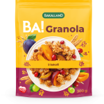 BA! Granola 5 bakalii to produkt, który jest gotowy do spożycia. Został umieszczony w wygodnym i praktycznym opakowaniu o gramaturze 300. Jest to miks płatków pełnoziarnistych i innych składników zbożowych wzbogaconych o bakalie takie jak: suszona żurawina, rodzynki, suszone śliwki, migdały oraz morele suszone. Granola ma chrupką konsystencję, która wynika z płatków pełnoziarnistych oraz migdałów. Tę strukturę przełamują elastyczne suszone owoce, które sprawiają, że jedzenie staje się jeszcze większą przyjemnością.