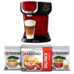 Ekspres kapsułkowy Bosch Tassimo My Way CZERWONY + 3xTassimo: Cafe Au Lait, Morning Cafe Strong&Intense XL, Latte Macchiato Classico