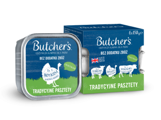 Butcher’s Original, karma dla psa, pasztet z wołowiną i wątróbką / z jagnięciną / kurczakiem i wątróbką, 4x150g