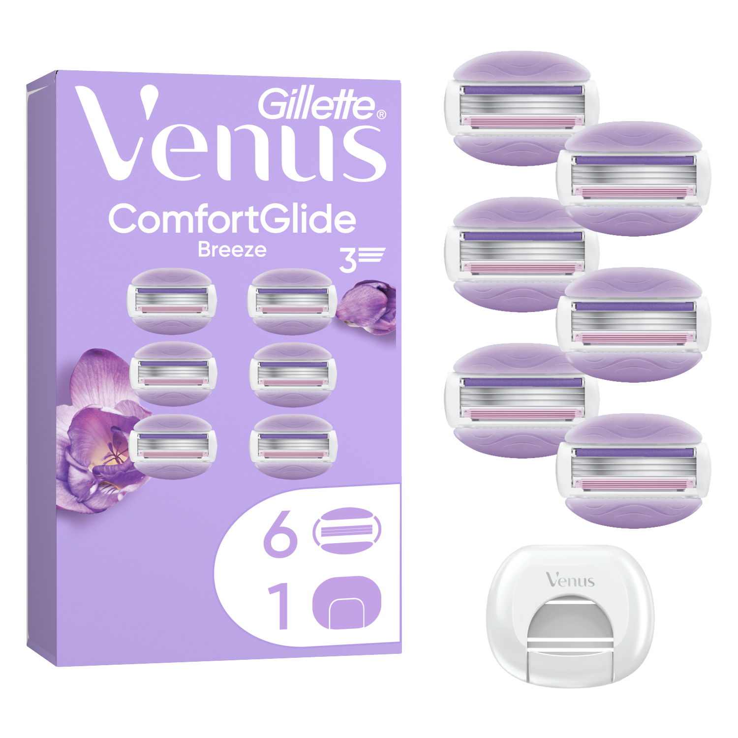 Zmień swój rytuał golenia w relaksujący zabieg spa. Ostrza Venus ComfortGlide z paskami żelowymi o zapachu frezji tworzą piankę i golą już za jednym pociągnięciem.