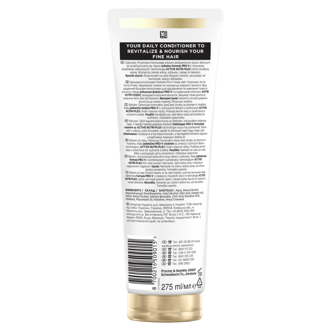 Odkryj odżywkę Pantene Aqualight, niezastąpionego sprzymierzeńca w codziennej pielęgnacji włosów. Odżywka do codziennego stosowania, zapewniająca cienkim włosom zdrowy wygląd. Odżyw włosy naszą unikalną mieszanką PRO-V: kombinacją prowitaminy B5, wzmacniających lipidów i ochronnych przeciwutleniaczy o silnym działaniu. Zaawansowana formuła z technologią ACTIVE NUTRI-PLEX wzbogacona o 50% więcej środków chroniących wiązania włosów pomaga wzmocnić cienkie włosy, zapewniając im potrzebne odżywienie bez obciążania ich. Testowana przez Swiss Vitamin Institute. Poczuj najdzwyczajną przyjemność pielęgnacji dzięki odżywce Pro-V Active Nutri-Plex Aqualight i zastosuj preparat, który sprawi, że Twoje włosy będą odżywione, zrewitalizowane i piękne od nasady aż po końce. ( vs. poprzednia formuła)