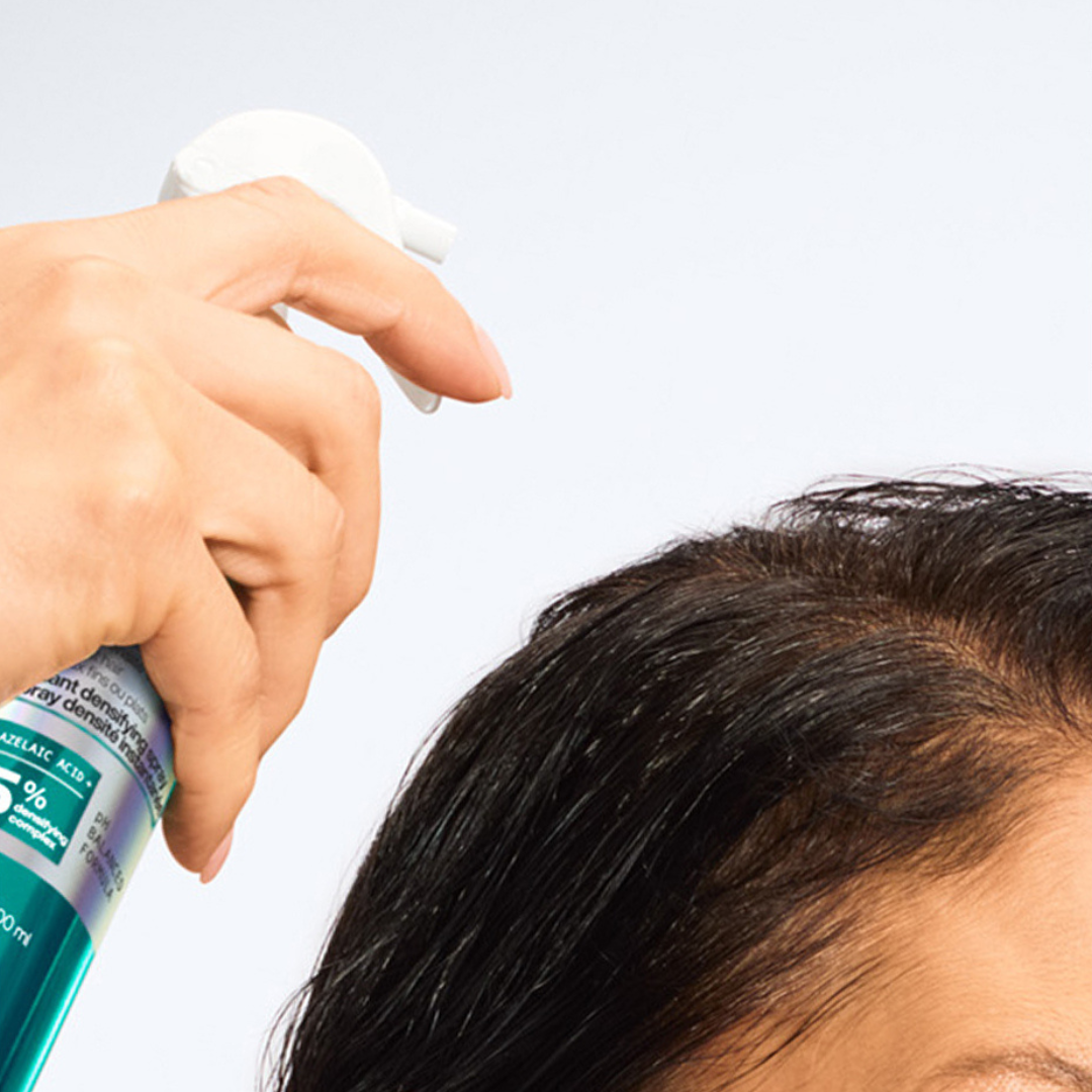 - Podziel włosy na sekcje i rozpyl produkt bezpośrednio na skórę głowy z odległości około 15 cm.