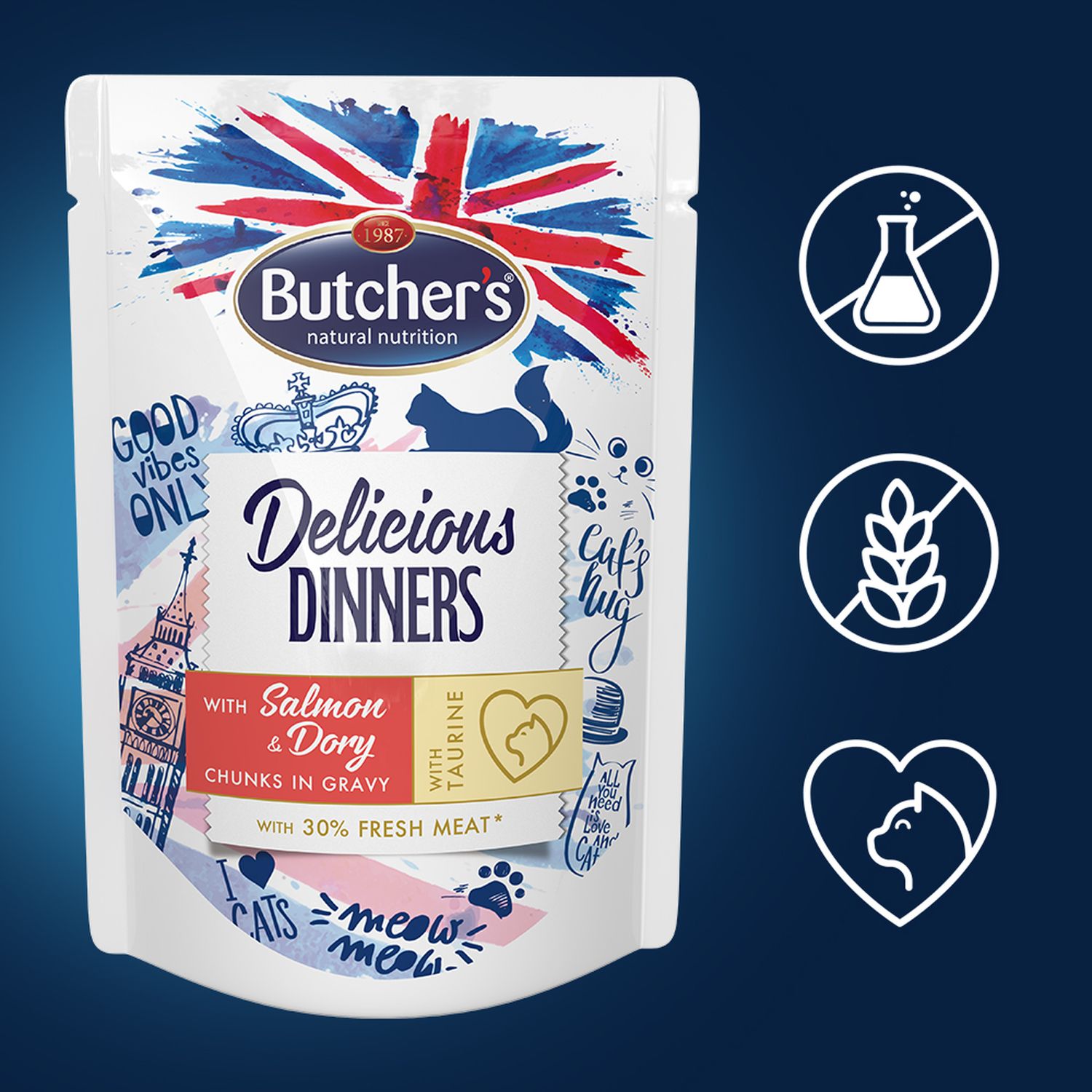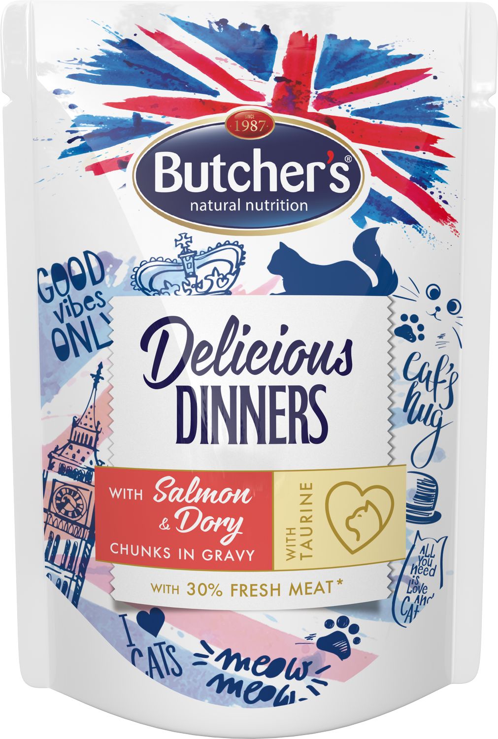 | Nazwa_na_karte | Butcher's Delicious Dinners Cat z łososiem i doradą kawałki w sosie 100 g |