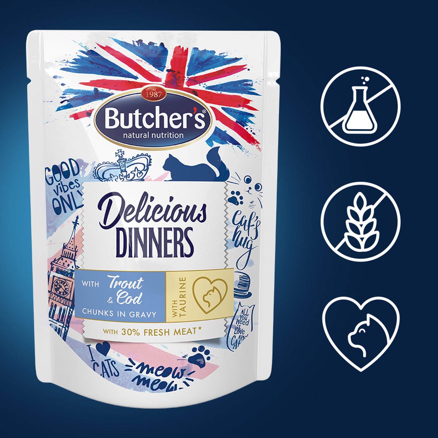 | Nazwa_na_karte | Butcher's Delicious Dinners Cat z pstrągiem i dorszem kawałki w sosie 100 g |
