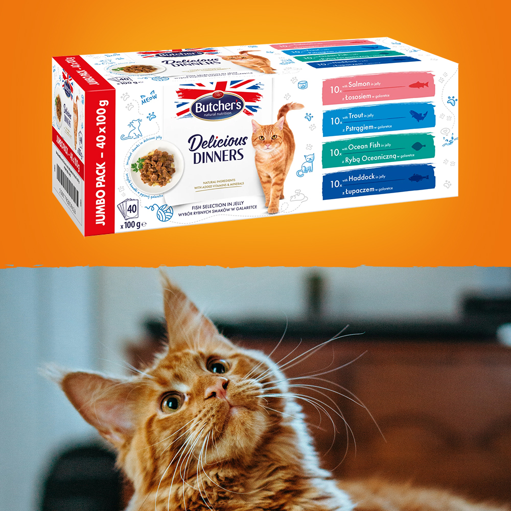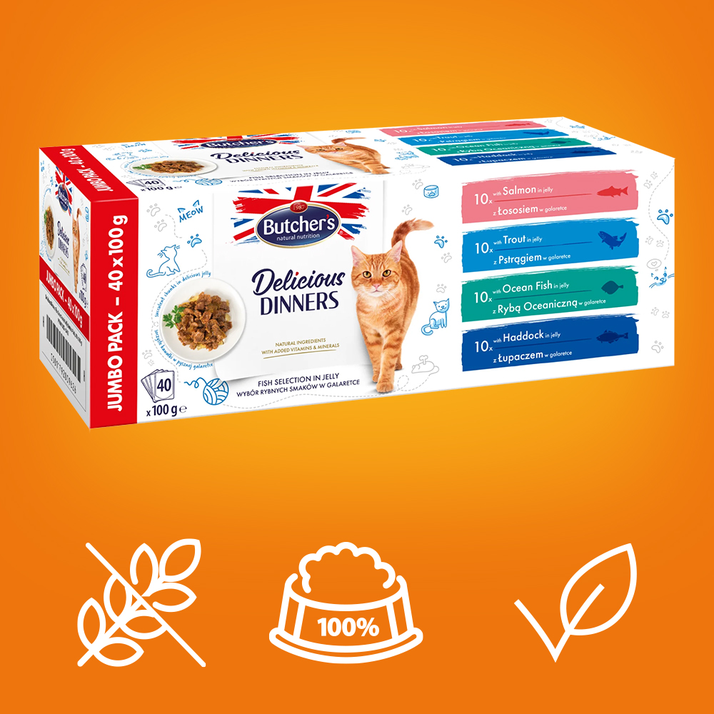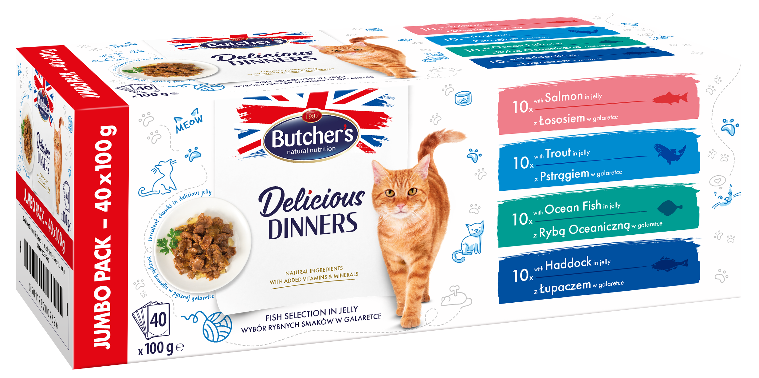 Butcher’s Delicious Dinners Jumbo Pack mokra karma dla kota łosoś/pstrąg/ryba oceaniczna/łupacz 40x100g