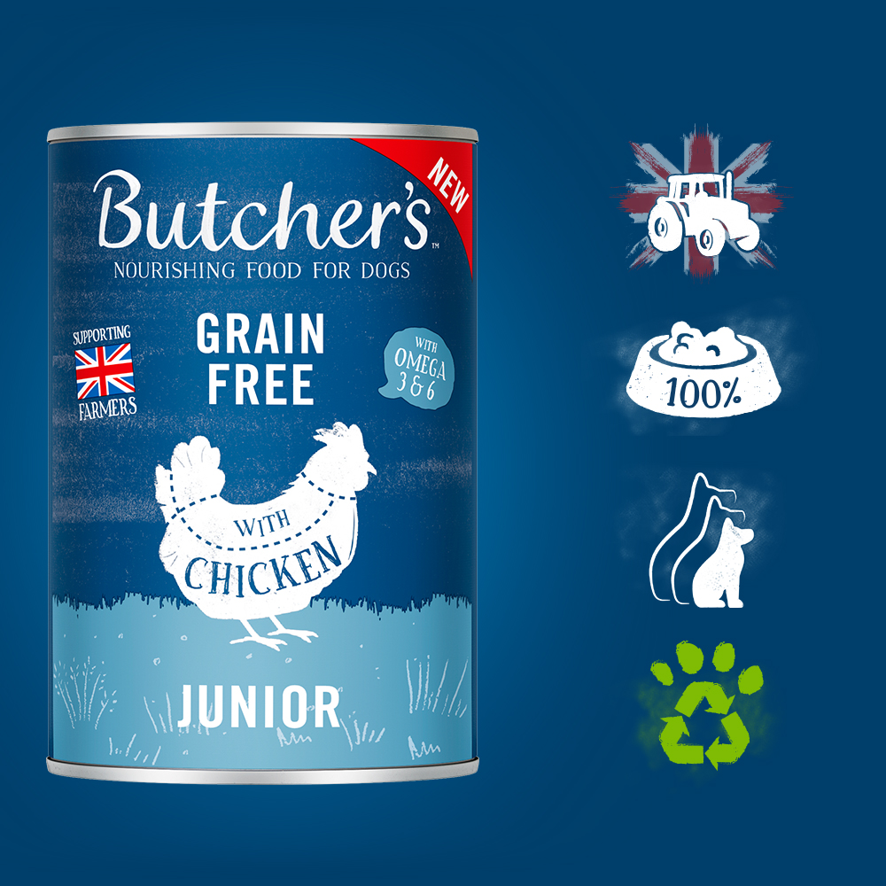 Butcher’s Original Junior to bezzbożowe karmy opracowane z myślą o potrzebach żywieniowych szczeniąt. Produkty z tej linii zostały stworzone tak by zapewnić szczeniakom najlepszy start w dorosłe życie. Wszystkie produkty powstają na bazie naturalnych składników i są zamknięte w opakowaniach przyjaznych środowisku