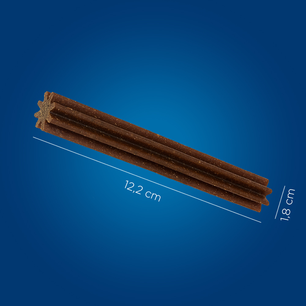 • Kształt i wielkość przekąski dopasowana do rozmiarów średnich psów (1 sztuka – 12,2 cm długość, 1,8 cm grubości)