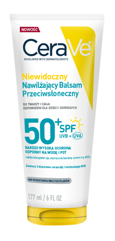 Niewidoczny, nawilżający balsam przeciwsłoneczny CeraVe do twarzy i ciała, zapewnia bardzo wysoką ochronę SPF50+ UVB + UVA w lekkiej, nawilżającej formule.