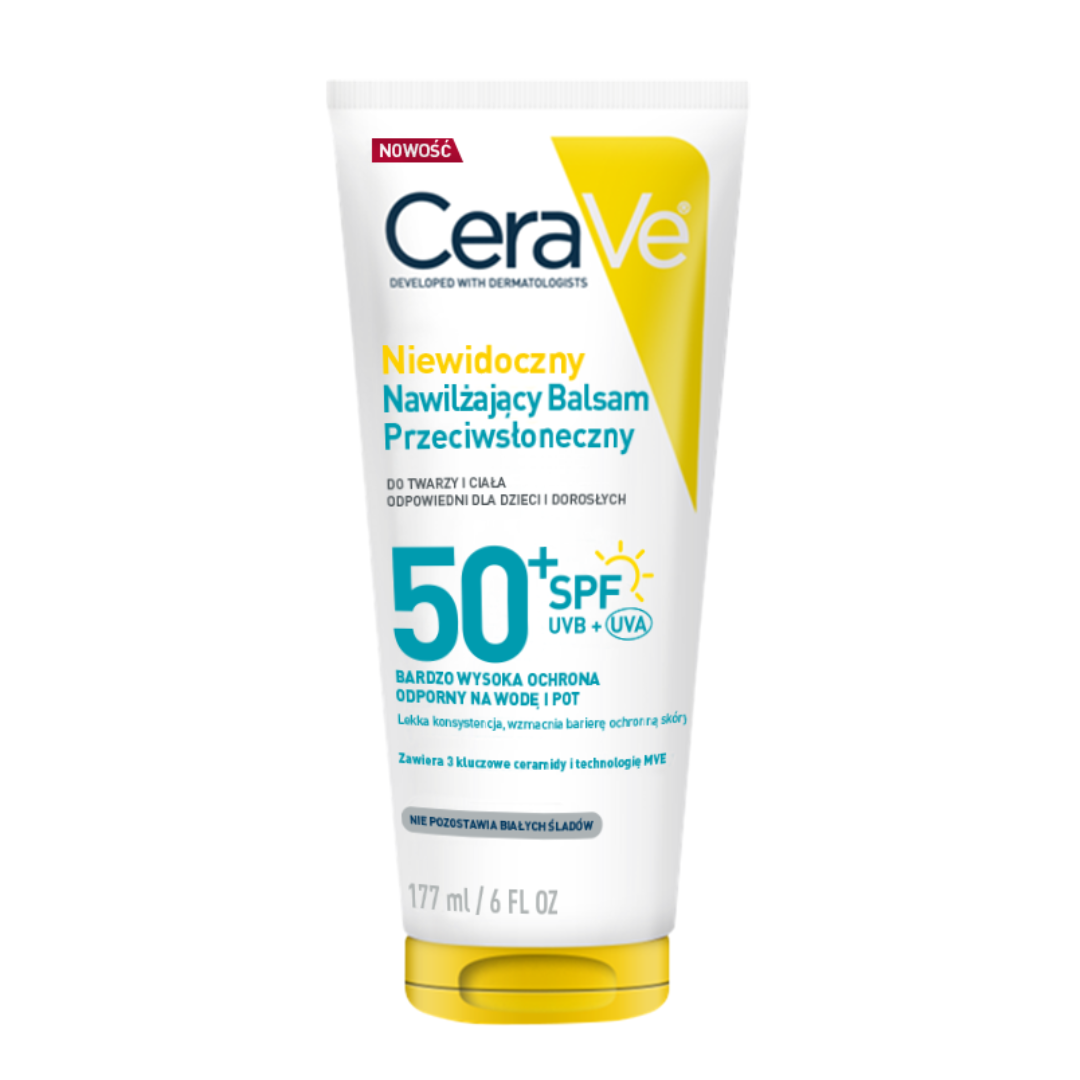 Niewidoczny, nawilżający balsam przeciwsłoneczny CeraVe do twarzy i ciała, zapewnia bardzo wysoką ochronę SPF50+ UVB + UVA w lekkiej, nawilżającej formule.