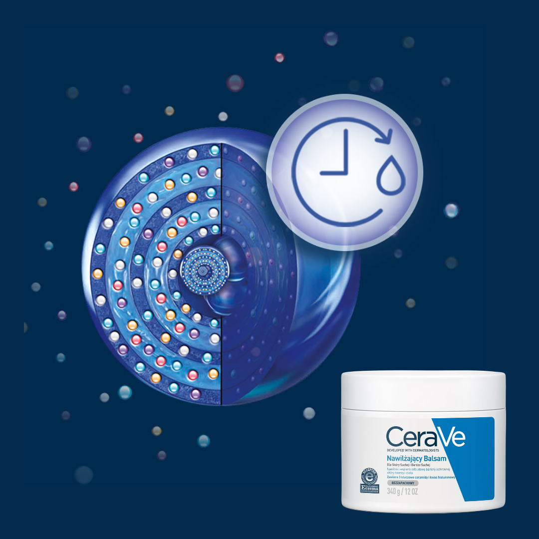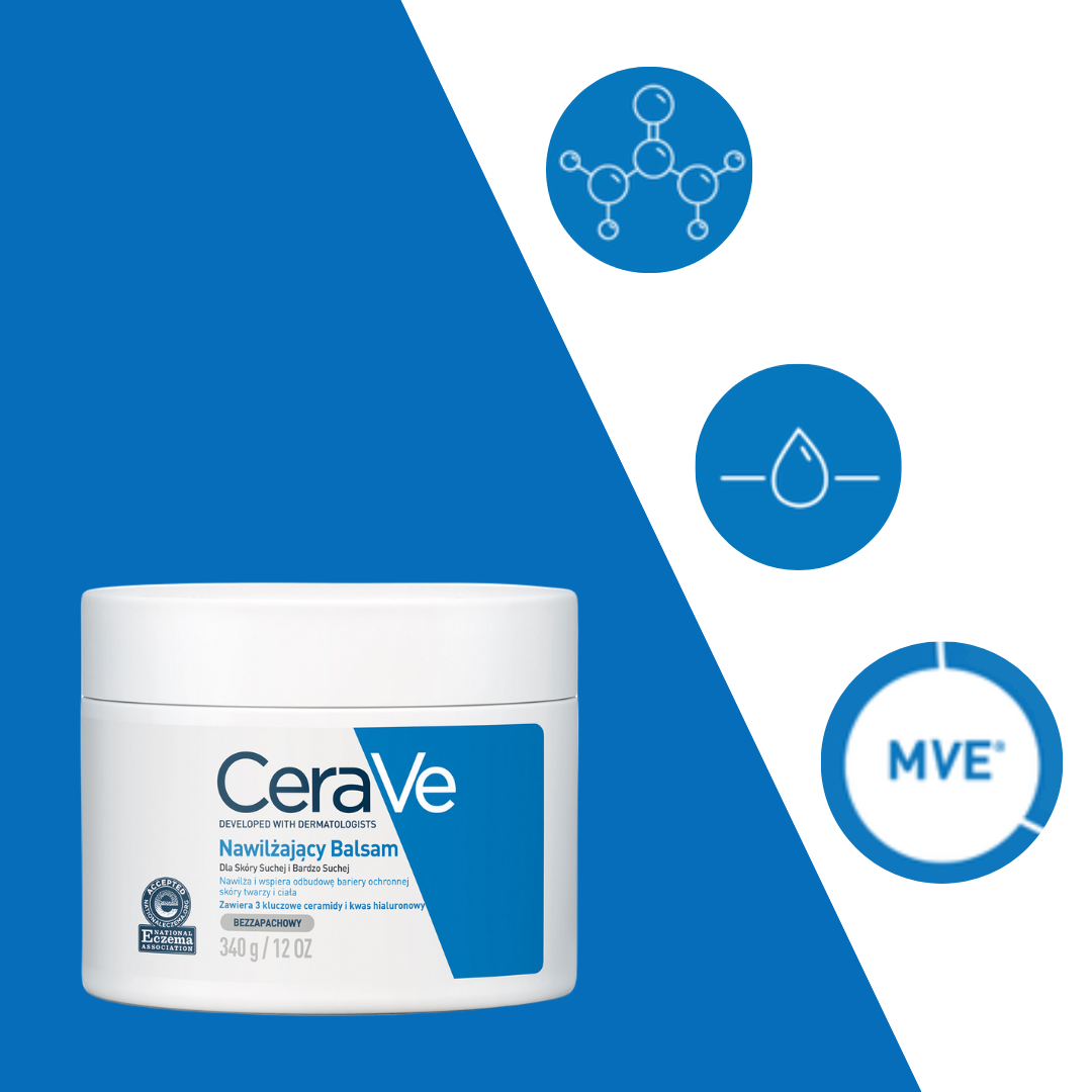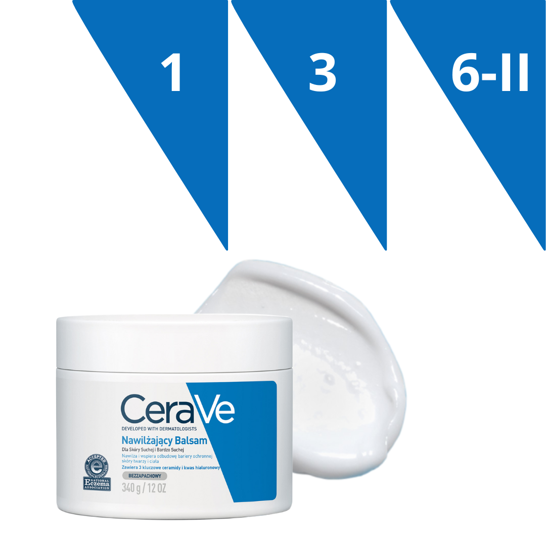 Dla uzyskania lepszego efektu – przed nałożeniem balsamu, umyj ciało i twarz używając Nawilżającej Emulsji do Mycia CeraVe, która wspiera odbudowę bariery ochronnej skóry.