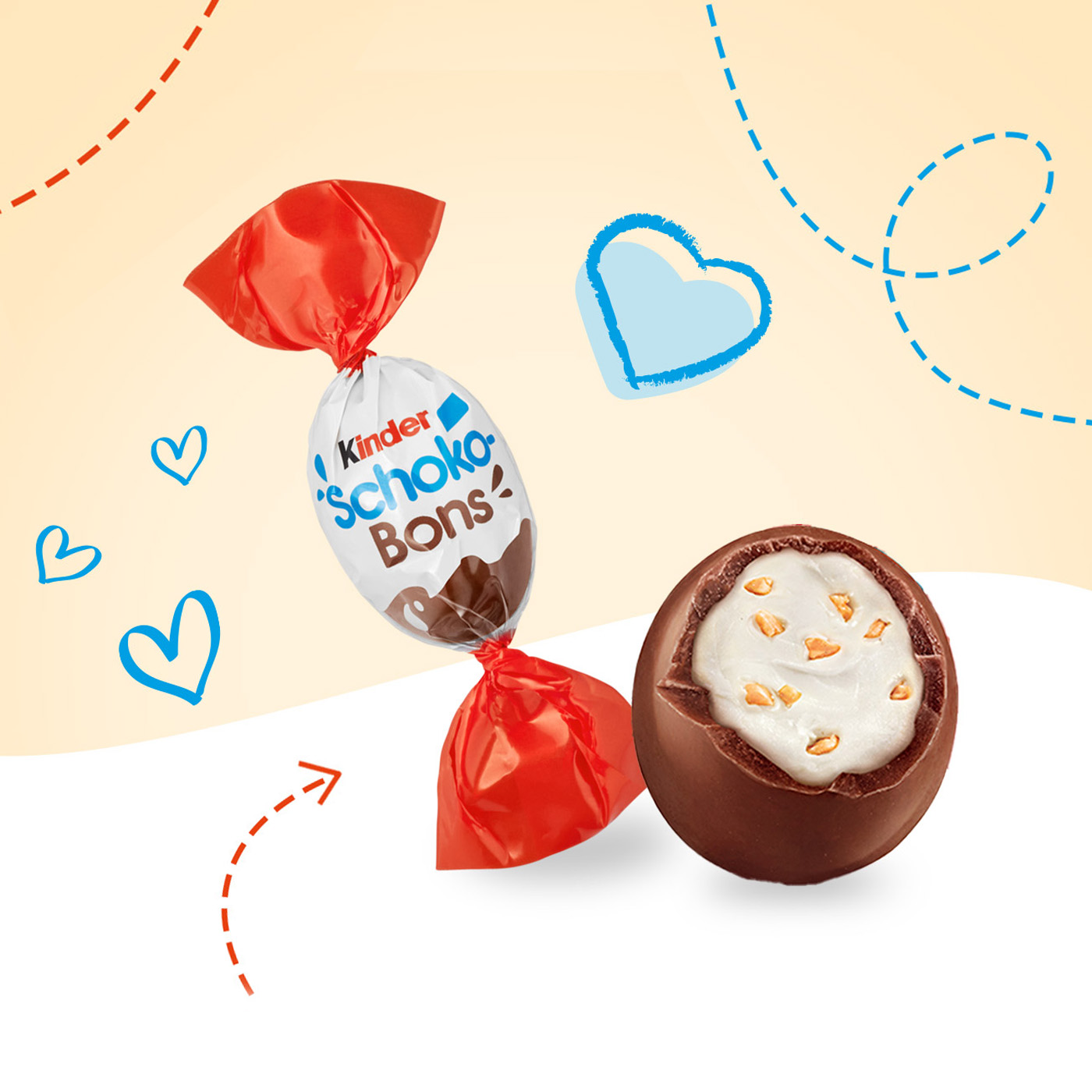 Czekoladki Kinder Schokobons to delikatny mleczny krem, kawałki orzecha laskowego oblane pyszną, mleczną czekoladą.