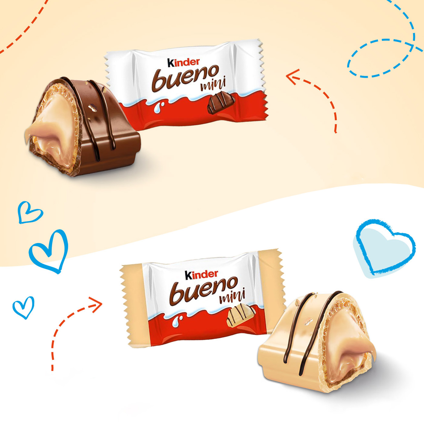 Kinder Bueno Mini to pojedynczo zapakowane porcje chrupiącego wafelka, delikatnego kremu i jedwabiście mlecznej czekolady, które wprost rozpływają się w ustach. Odkryj również Kinder Bueno White Mini, chrupiący wafelek z lekkim orzechowym nadzieniem, oblany delikatną białą czekoladą i kakaową posypką bezową.