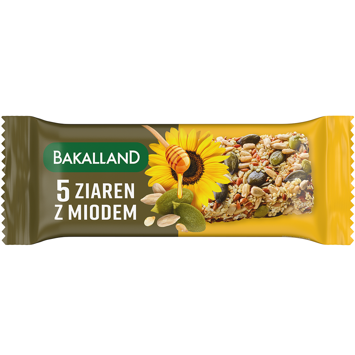 Bakalland BA! Baton zbożowy 5 ziaren 40 g to apetyczna kompozycja najwyższej jakości ziaren i naturalnego miodu. Starannie dobrana receptura tworzy wyjątkowe połączenie smakowe i wartościowe źródło energii na każdy dzień. Ziarna sezamu, siemienia lnianego, dyni, słonecznika i amarantusa zapewniają bogactwo witamin oraz minerałów.