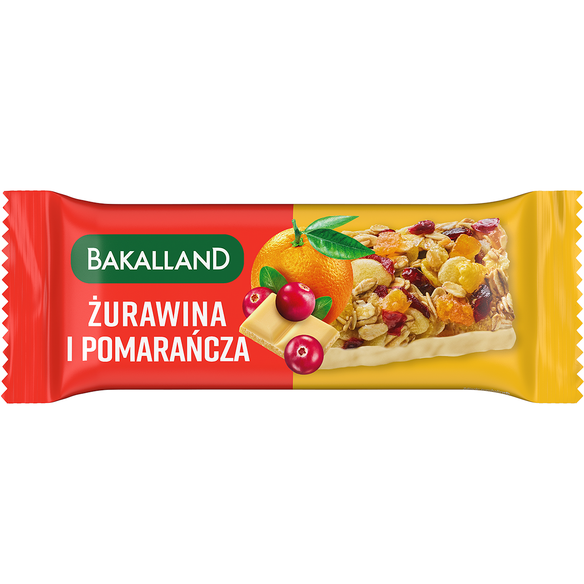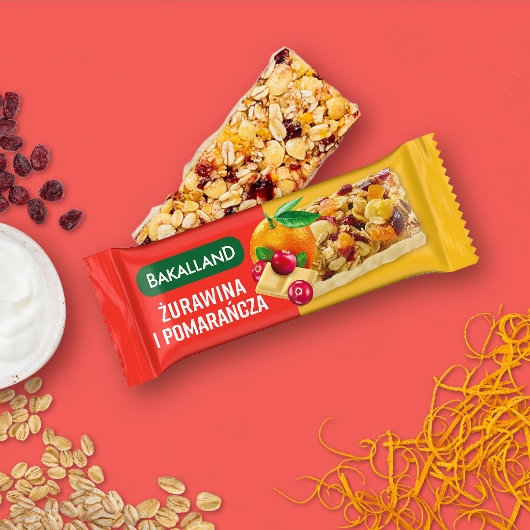 Bakalland BA! Baton zbożowy Żurawina i Pomarańcza to doskonała alternatywa dla niezdrowych przekąsek. Łączy w sobie intensywny smak żurawiny i aromatyczną nutę pomarańczy, tworząc pełną energii i smaku przekąskę. Został stworzony na bazie najwyższej jakości suszonej żurawiny oraz polskich zbóż.