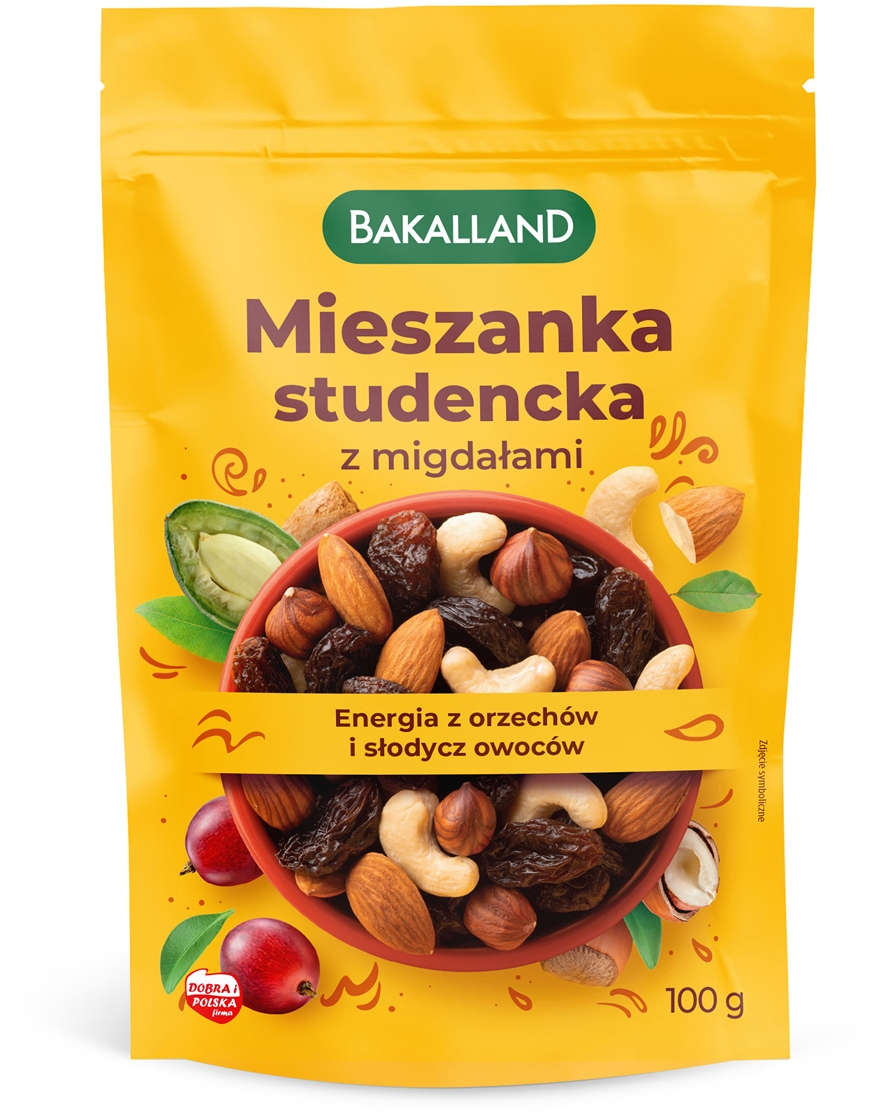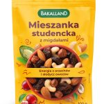 Bakalland Mieszanka studencka z migdałami 100 g to mix różnych bakalii – rodzynek, orzechów nerkowca, orzechów laskowych oraz migdałów. Mieszanka łączy w sobie miękkości i słodycz suszonych winogron z chrupkością orzechów. Jest to zdrowa przekąska do pracy, szkoły czy w podróży. Doskonale sprawdzi się również jako przegryzka do pochrupania podczas oglądania filmów lub seriali. Możesz także wykorzystać ją w kuchni – świetnie sprawdzi się jako dodatek do wielu śniadaniowych klasyków takich jak: owsianka, jaglanka, płatki na mleko, a także naleśniki czy gofry. Garść mieszanki studenckiej z migdałami to również smaczny i zdrowy dodatek do sałatek i surówek, dzięki nim posiłek stanie się bardziej treściwy i dostarczy Ci więcej wartości odżywczych.