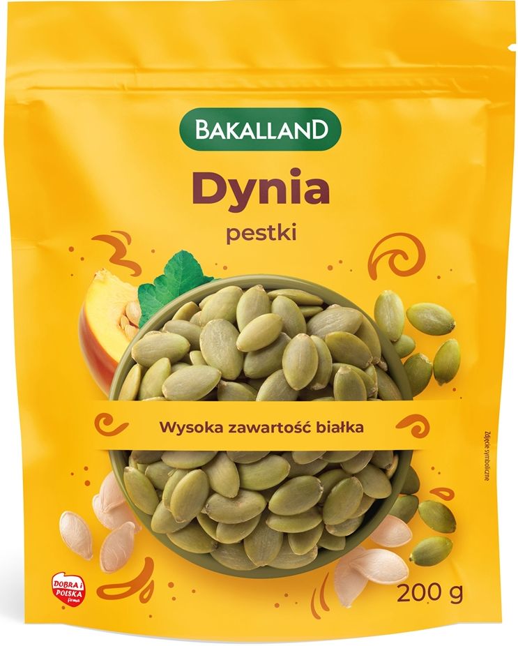 Bakalland Pestki dyni to najwyższej jakości ziarna, które mają ciemnozielony kolor oraz charakteryzują się dużą chrupkością. Są pozbawione gorzkich nut, a ich smak jest delikatny. Pestki dyni marki Bakalland mają wysoką zawartość białka, dzięki czemu są cenioną i pożywną przekąską, a także dodatkiem do wielu dań. Mają prosty skład, który zawiera jedynie pestki dyni, bez żadnych dodatków i ulepszaczy. Produkt jest szczelnie zapakowany, dzięki czemu zachowuje swoją chrupkość i świeżość. Pestki dyni marki Bakalland są już wyłuskane, co oznacza, że są gotowe do spożycia. Zaraz po otwarciu opakowania możesz je zjeść lub dodać do swojego dania.
