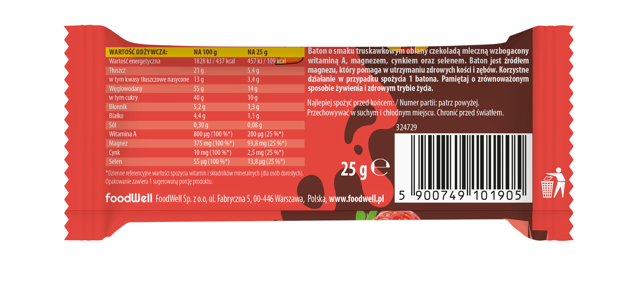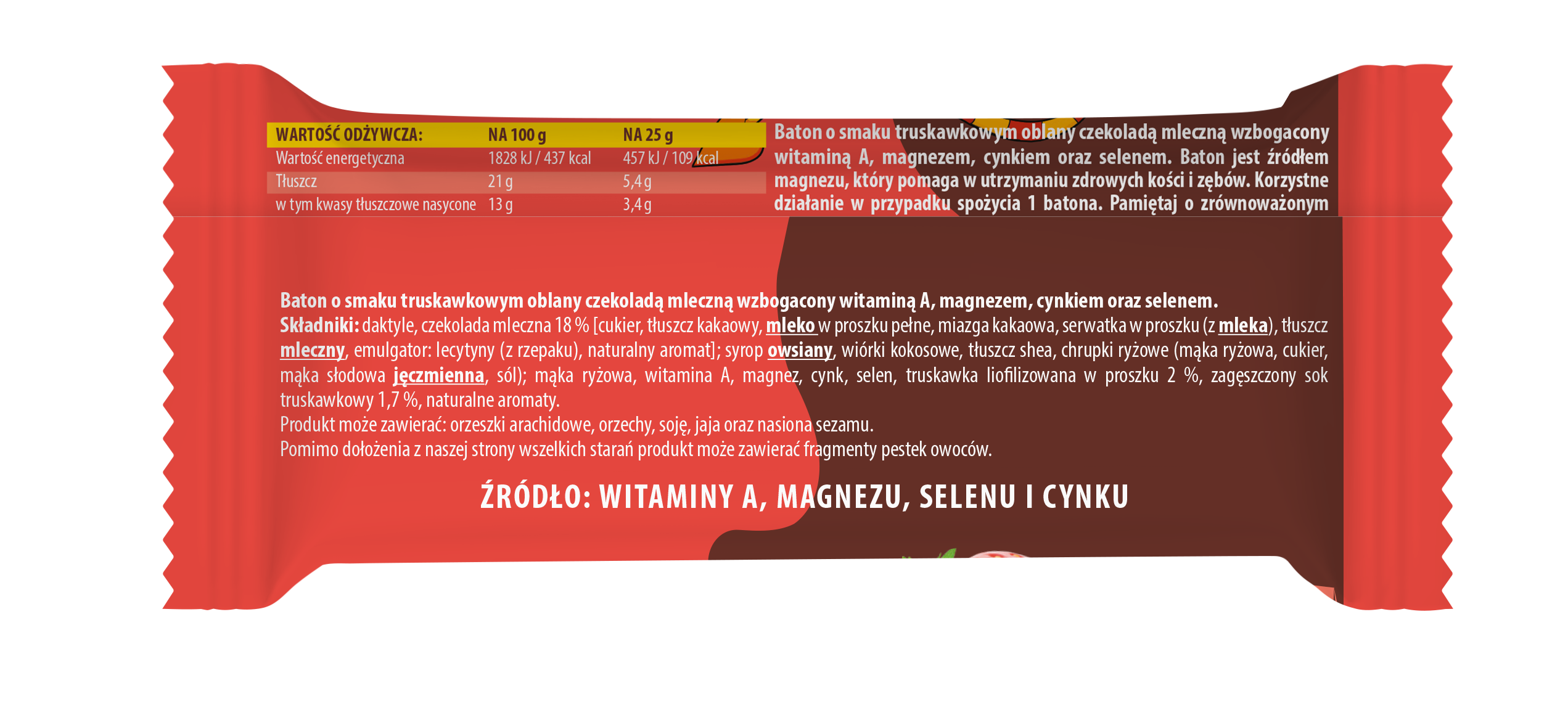 Baton o smaku truskawkowym oblany czekoladą mleczną wzbogacony witaminą A, magnezem, cynkiem oraz selenem. Produkt gotowy do spożycia. Wykluczona grupa użytkowników: osoby z nietolerancją na gluten, mleko, orzeszki ziemne, orzechy, soję, jaja oraz nasiona sezamu