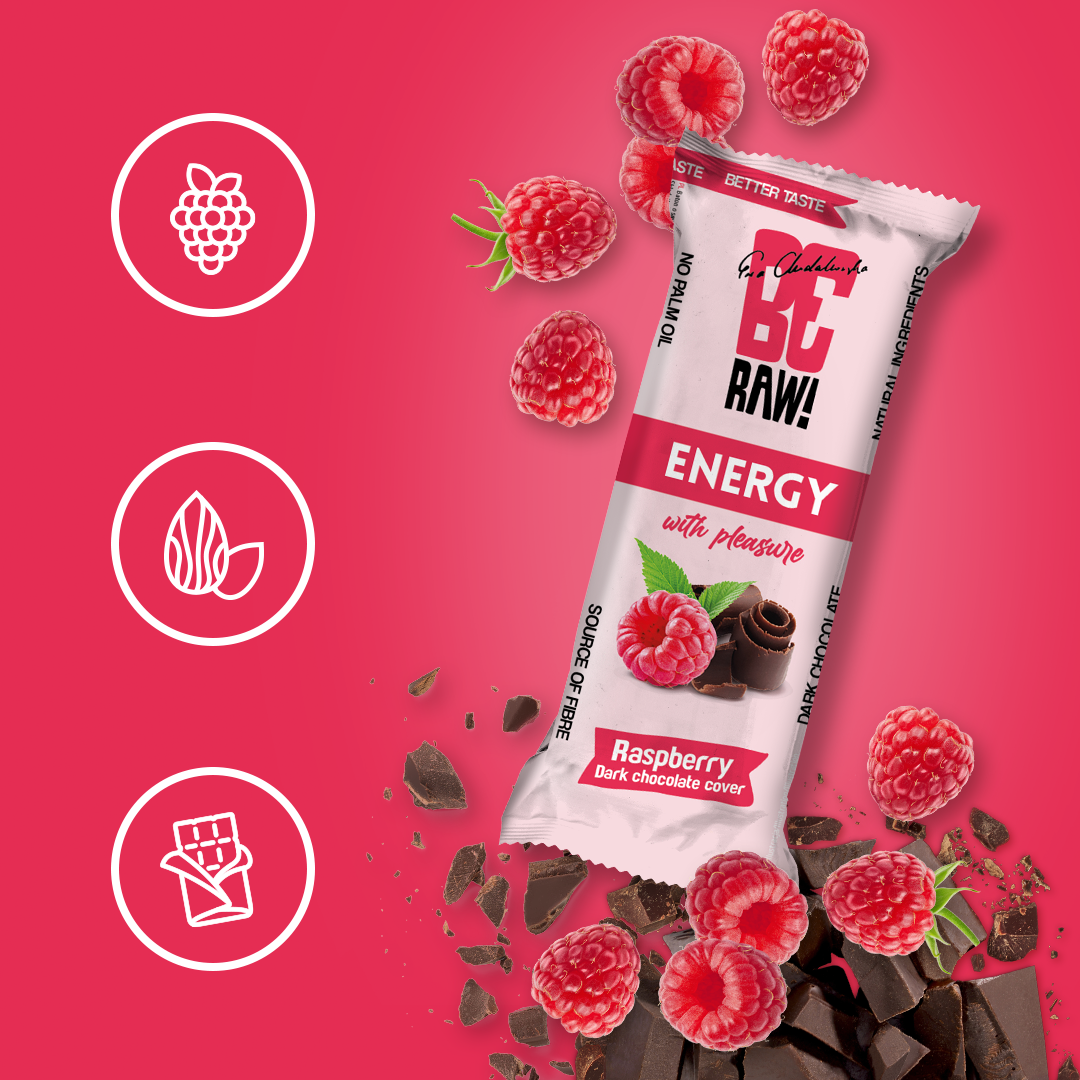 BeRAW Raspberry Energy to pyszny baton energetyczny, który łączy w sobie naturalną słodycz daktyli, soczystość malin i delikatną gorycz gorzkiej czekolady. Wzbogacony migdałami i rodzynkami, dostarcza energii i wartości odżywczych w każdej sytuacji. Idealny wybór dla osób, które cenią sobie zdrowy styl życia i smakowite przekąski.