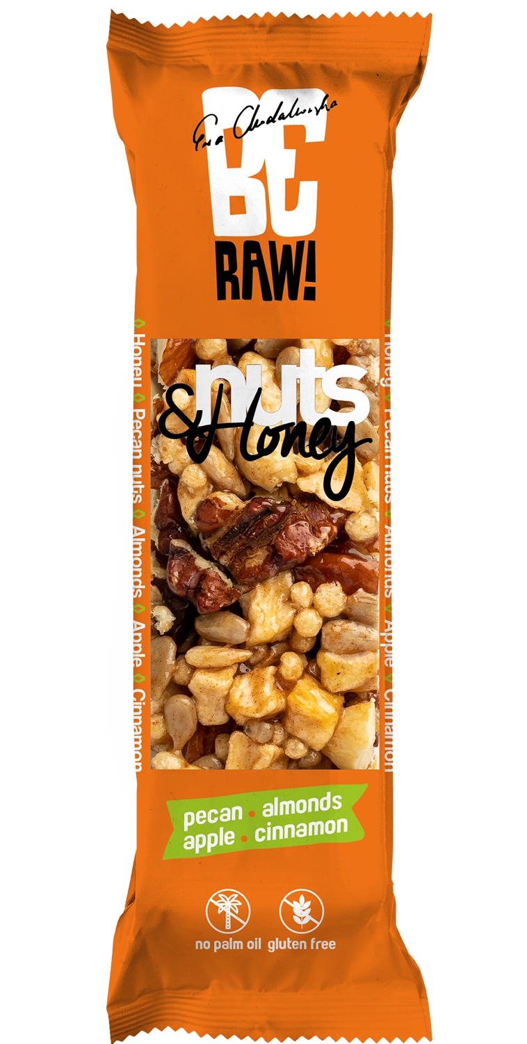 BeRAW Nuts&Honey, baton orzechowo – miodowy z orzechami pekan to pyszny i chrupiący baton. Mieszają się w nim smaki orzechów pekan, migdałów, ziaren słonecznika, chrupek ryżowych oraz miodu. W czasie jedzenia na pewno wyczujesz również nutę suszonego jabłka z cynamonem. Taki batonik to świetna alternatywa dla konwencjonalnych słodyczy, który możesz zjeść w czasie przerwy w pracy, podczas nauki, w szkole, na spacerze, czy wycieczce w góry. Porcja orzechów pozwoli Ci z nową energią robić to, co lubisz. Baton Nuts &Honey z orzechami pekan to produkt wykonany z naturalnych składników. Ma prosty i krótki skład. Nie ma w nim oleju palmowego ani syropu glukozowo-fruktozowego.