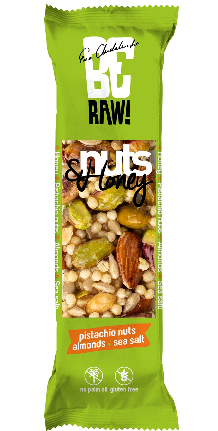 BeRAW Nuts &Honey, baton orzechowo-miodowy z pistacjami to baton na bazie orzechów, który charakteryzuje się dużą chrupkością. Przenikają się w nim smaki: pistacji, migdałów, orzechów brazylijskich, orzeszków ziemnych, ziaren słonecznika i chrupek ryżowych. Tę słodką kompozycję przełamuje sól morska, którą baton jest wykończony. Słony smak idealnie komponuje się z orzechami, a zwłaszcza z pistacjami. Baton Nuts &Honey z pistacjami to produkt wykonany z naturalnych składników. Ma prosty i krótki skład. Nie ma w nim oleju palmowego ani syropu glukozowo-fruktozowego. Baton ten idealnie sprawdzi się jako zamiennik konwencjonalnych słodyczy. Możesz zabrać go ze sobą na spacer, do pracy, szkoły, czy na wycieczkę. Stanowi zdrową przekąskę na drugie śniadanie lub podwieczorek.