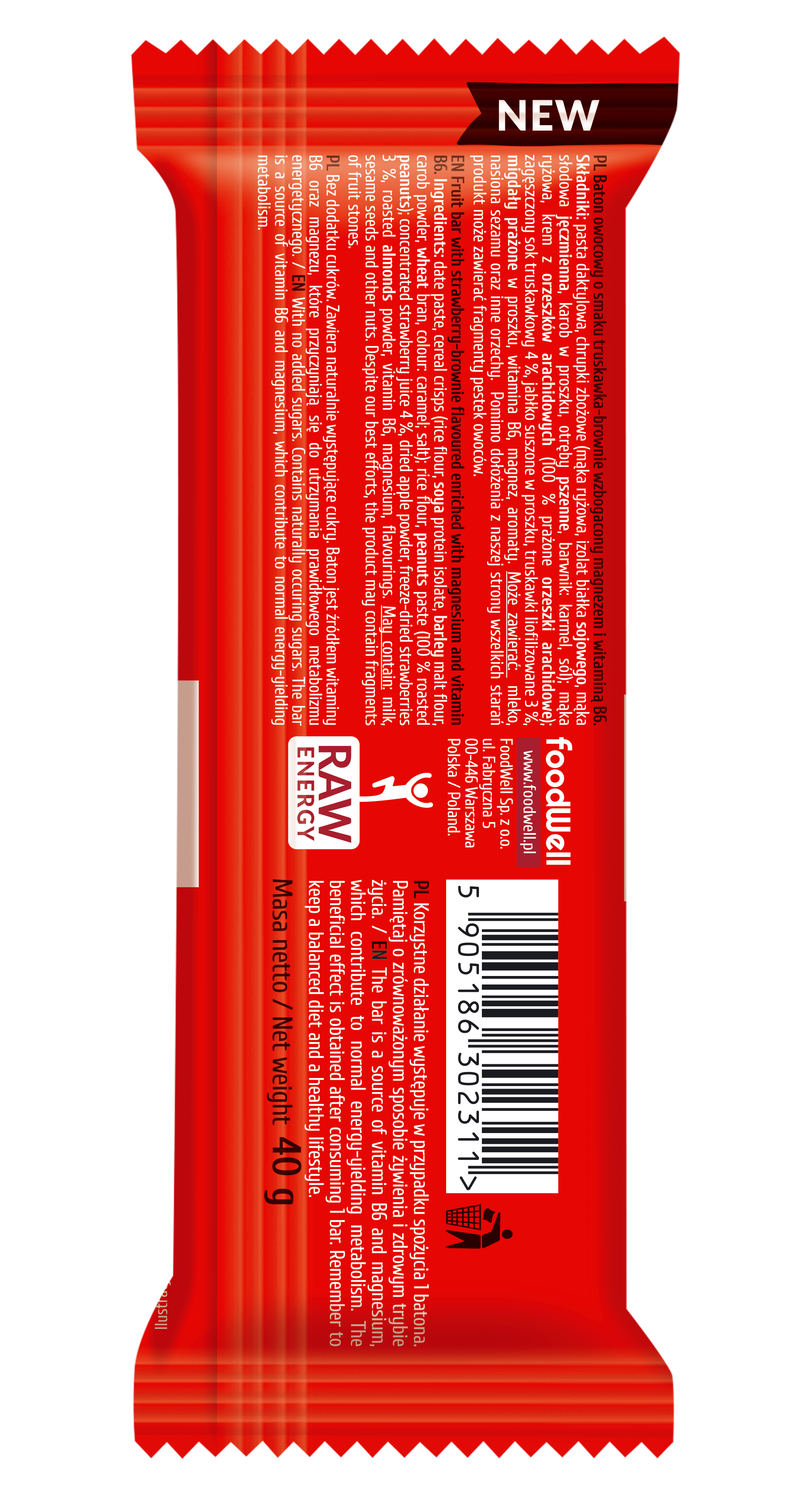Baton BeRAW Crispy Fruit Truskawka & Brownie to nie tylko smak, ale także wartościowe składniki. Jest źródłem witaminy B6 oraz magnezu, które wspierają prawidłowy metabolizm energetyczny, dodając sił na cały dzień.