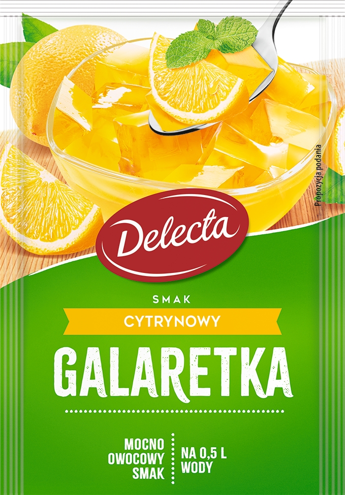 Galaretka smak cytrynowy Delecta to najpopularniejszy z deserów. Idealnie nadaje się jako samodzielny deser na zimno, pysznie smakuje z dodatkiem świeżych owoców i z bitą śmietaną. Galaretka o smaku cytrynowym to również niezawodny składnik ciast, doskonale komponuje się z ciastem biszkoptowym lub kruchym, letnimi owocami, czy sernikiem na zimno. Galaretki to idealna propozycja dla wielbicieli chłodzących deserów na okres lata. Można je podać w sposób tradycyjny w pucharku, można pokroić w kostkę, czy rozpuścić w większej ilość wody i otrzymać w ten sposób orzeźwiający owocowy napój na upalne dni.