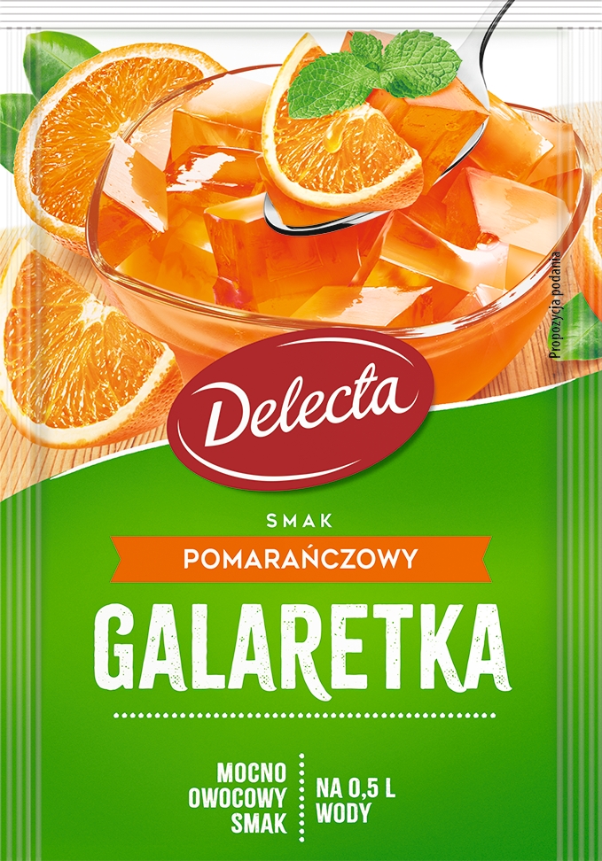 Galaretka smak pomarańczowy Delecta to najpopularniejszy z deserów. Idealnie nadaje się jako samodzielny deser na zimno, pysznie smakuje z dodatkiem świeżych owoców i z bitą śmietaną. Galaretka o smaku pomarańczowym to również niezawodny składnik ciast, doskonale komponuje się z ciastem biszkoptowym lub kruchym, letnimi owocami, czy sernikiem na zimno. Galaretki to idealna propozycja dla wielbicieli chłodzących deserów na okres lata. Można je podać w sposób tradycyjny w pucharku, można pokroić w kostkę, czy rozpuścić w większej ilość wody i otrzymać w ten sposób orzeźwiający owocowy napój na upalne dni.