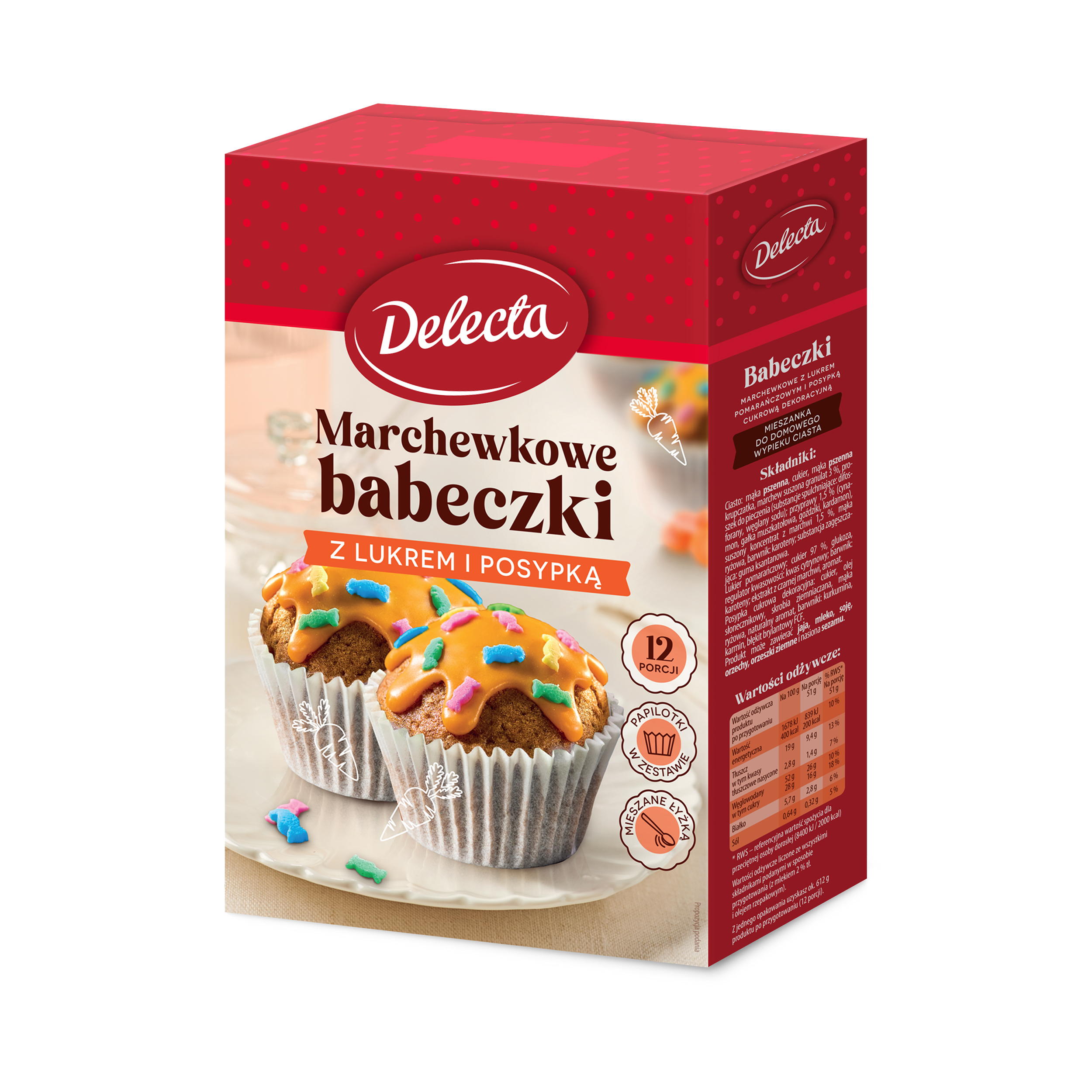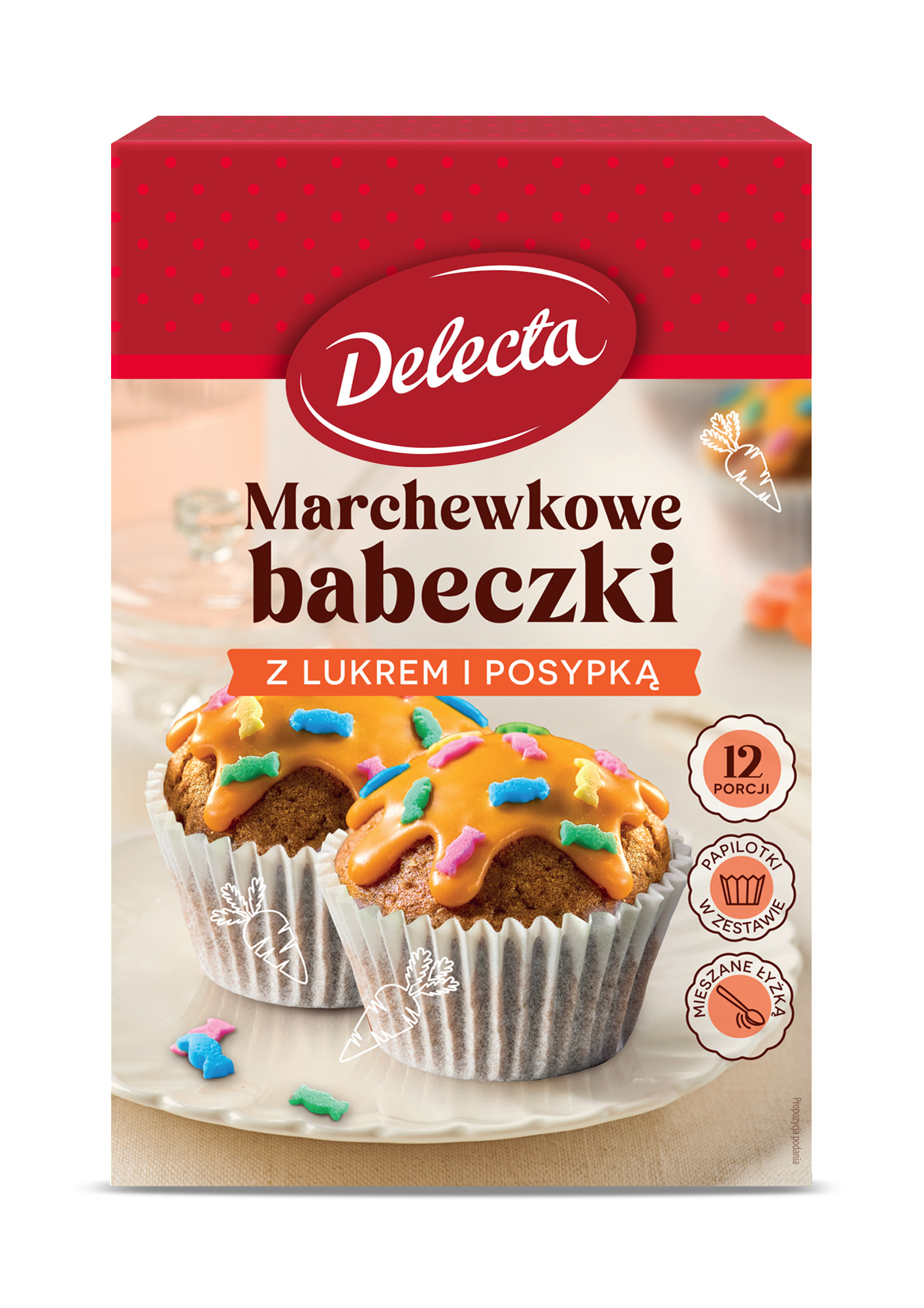 Babeczki marchewkowe z lukrem pomarańczowym i posypką 12szt Delecta 360g