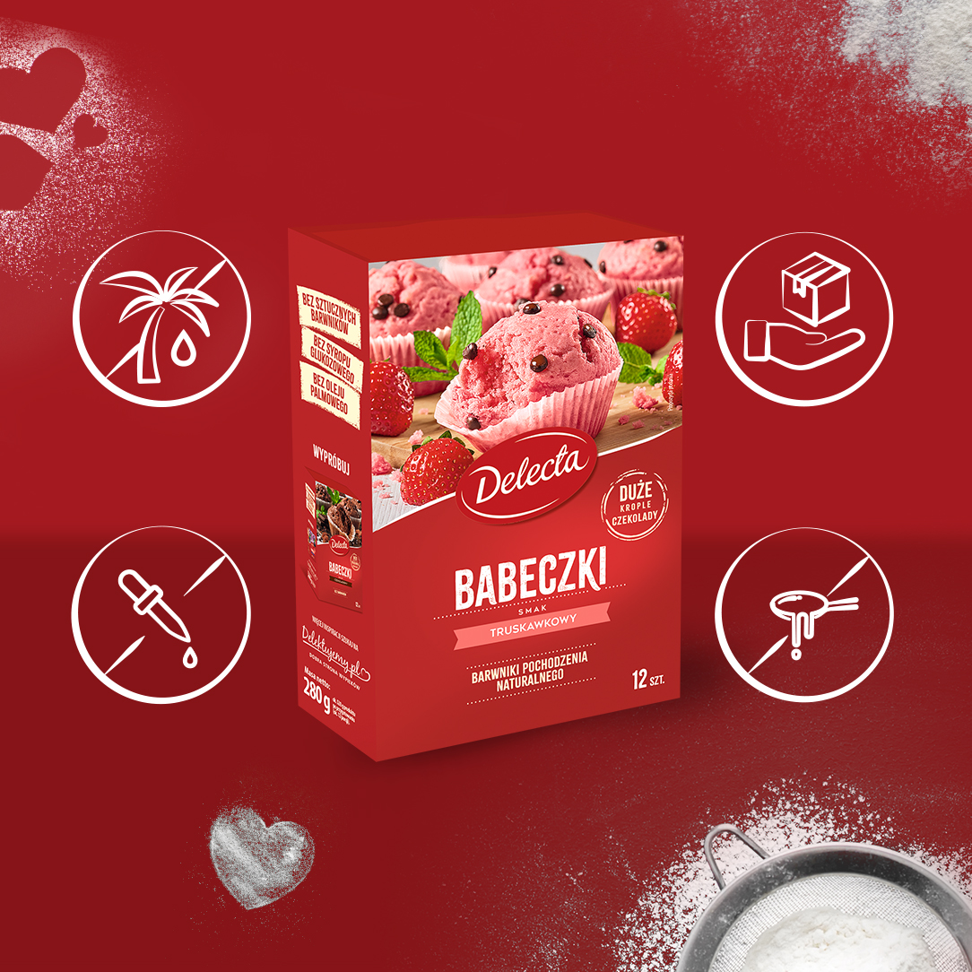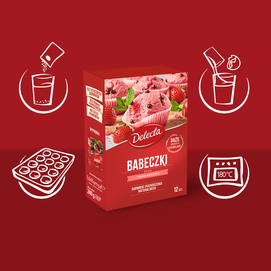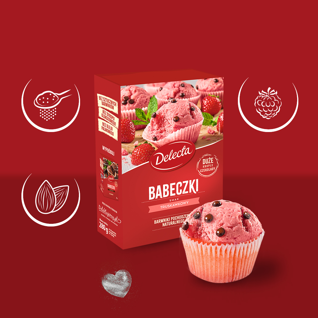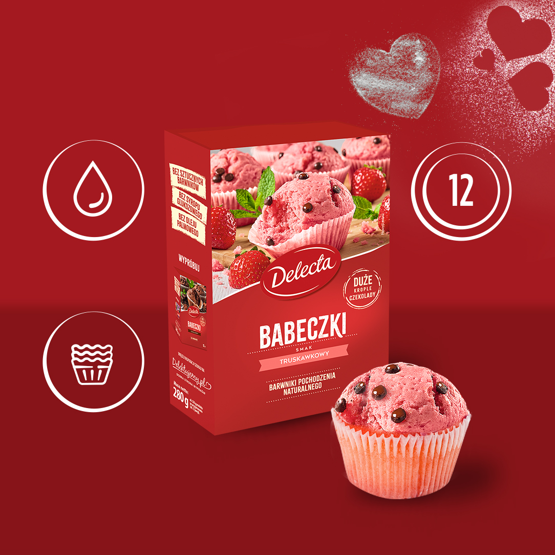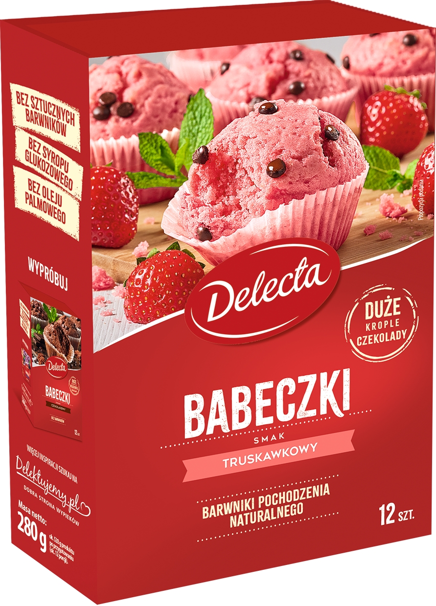 Babeczki truskawkowe od Delecty to połączenie puszystego ciasta, intensywnego smaku truskawek i delikatnych kropli czekolady. Ich piękny kolor pochodzi wyłącznie z naturalnych ekstraktów roślinnych, a prosty skład gwarantuje doskonały domowy wypiek. W opakowaniu znajdziesz również papierowe foremki, które ułatwią przygotowanie.