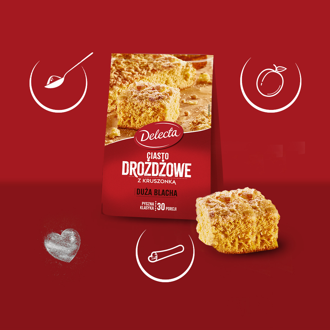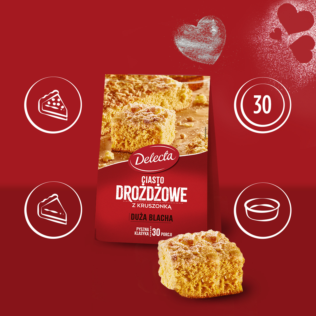 Ciasto drożdżowe to klasyczny wypiek, który od lat króluje na polskich stołach. Dzięki gotowej mieszance Delecta w kilka kroków przygotujesz puszyste ciasto z chrupiącą kruszonką. To idealna propozycja na rodzinne spotkania i codzienne słodkie przyjemności.