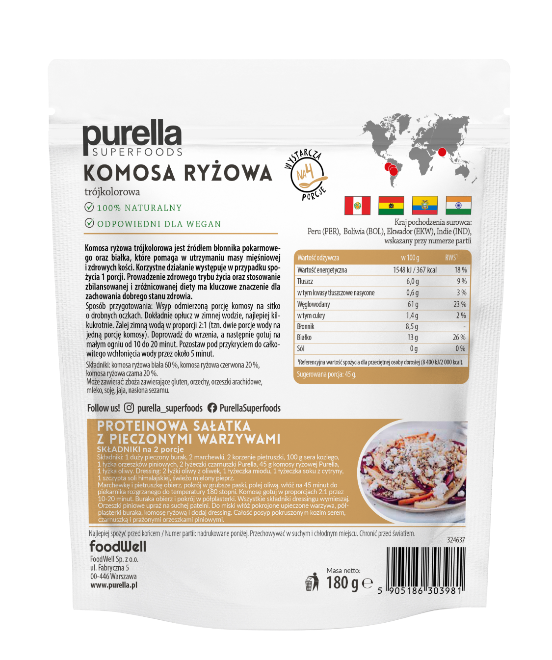 | Składniki | komosa ryżowa biała 60 %, komosa ryżowa czerwona 20 %, komosa ryżowa czarna 20 % |