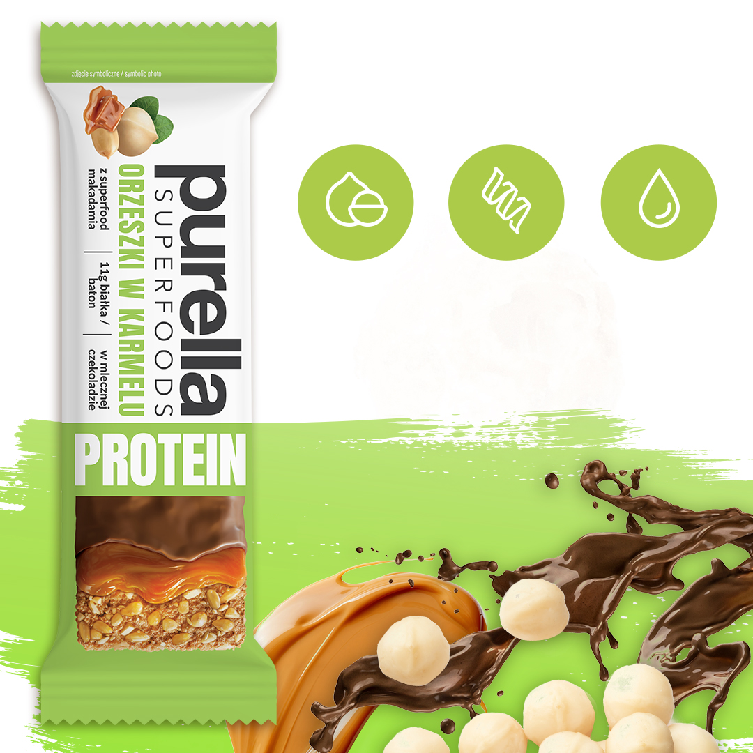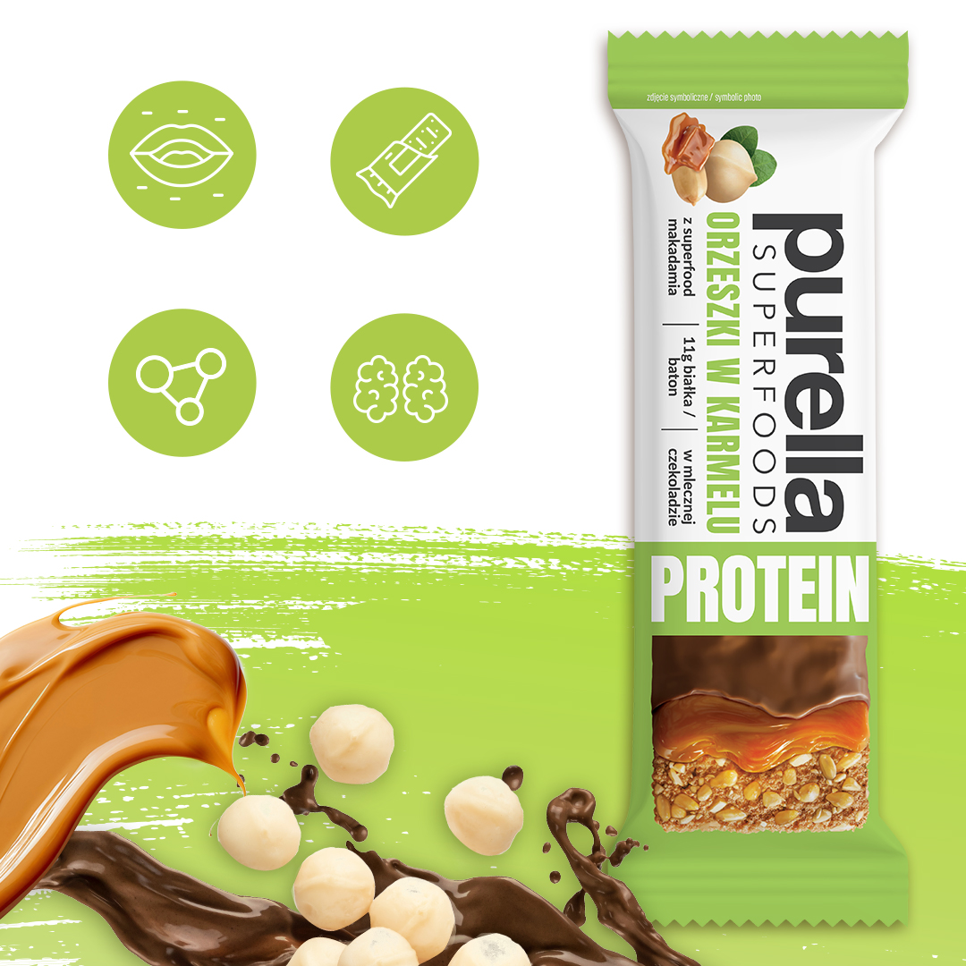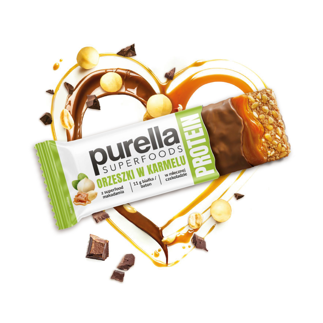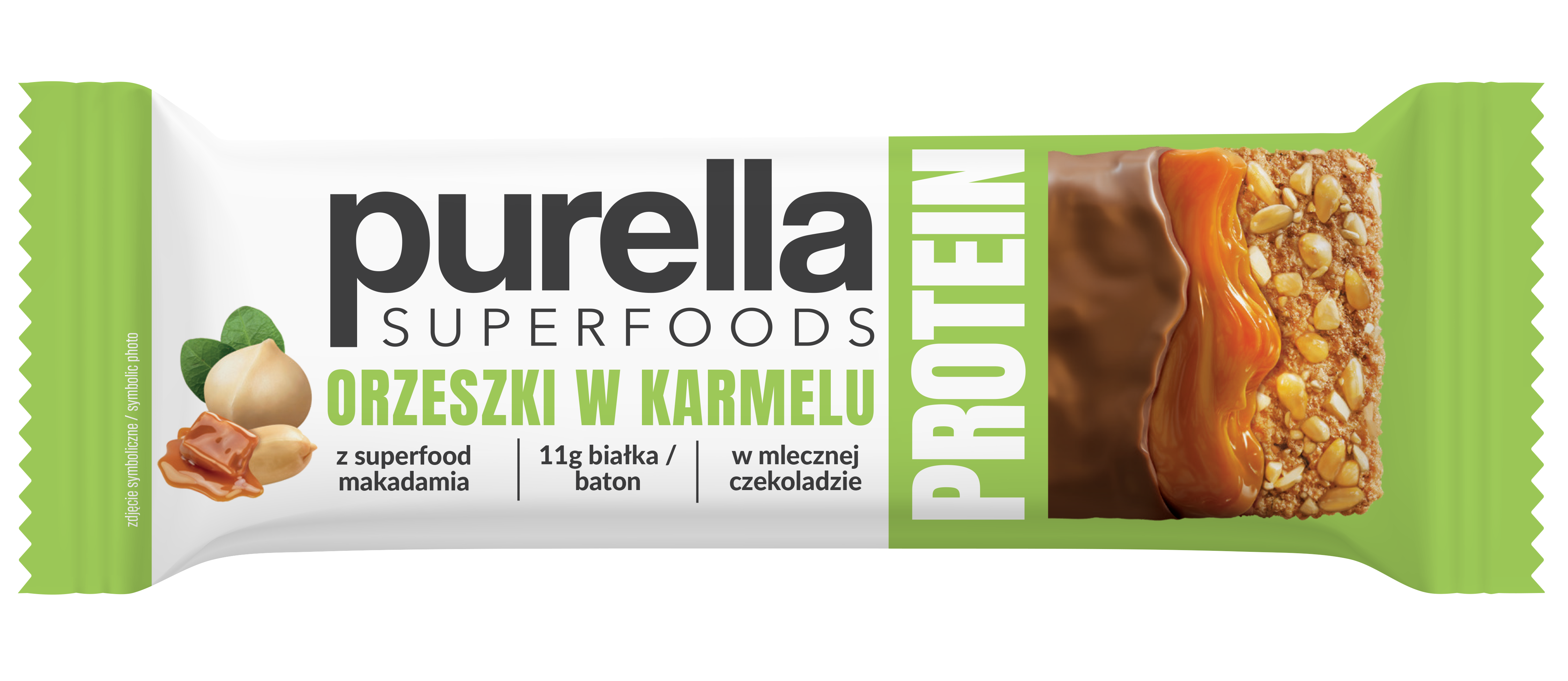 Baton proteinowy Purella Superfoods Orzeszki w Karmelu 11g białka 45g