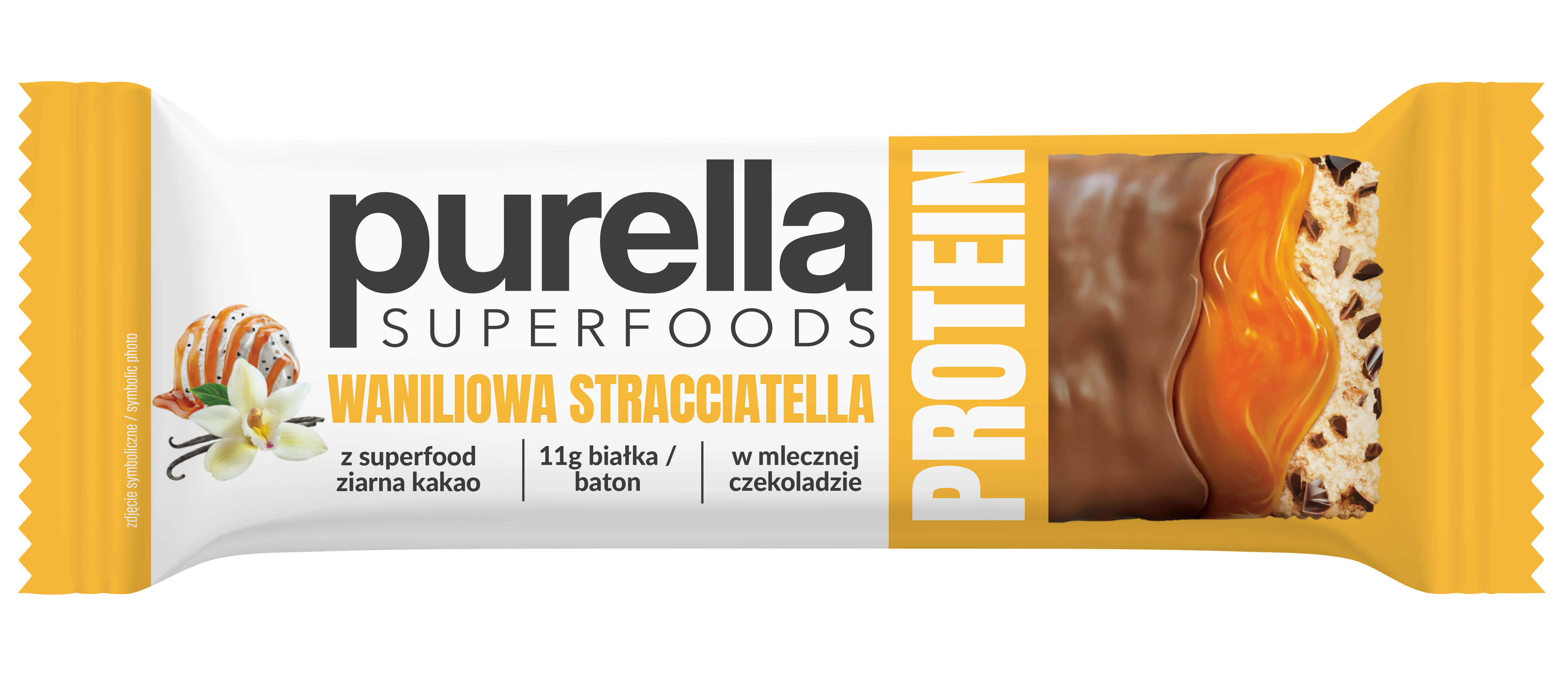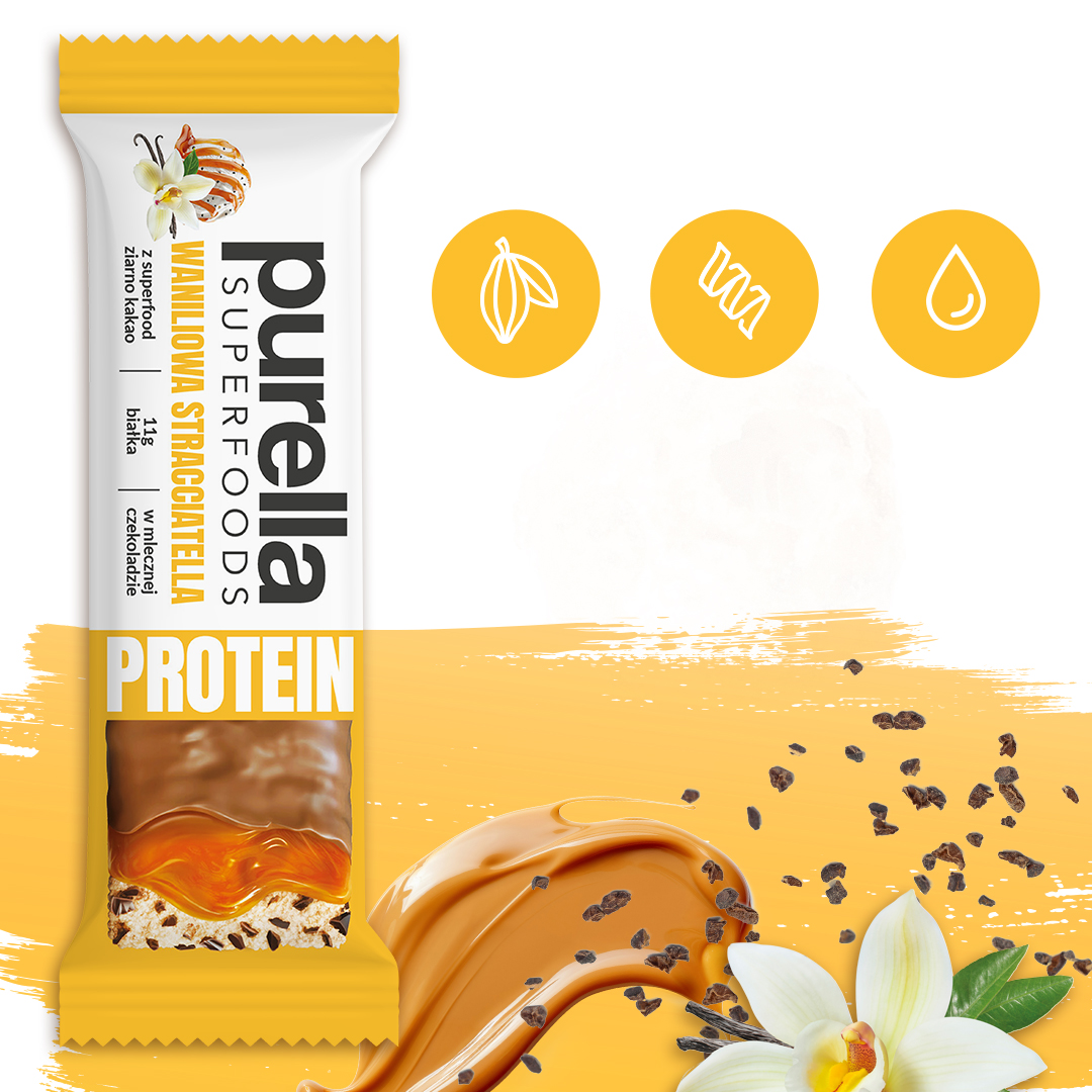 Baton proteinowy Purella Superfoods Waniliowa Stracciatella 11g białka 45g