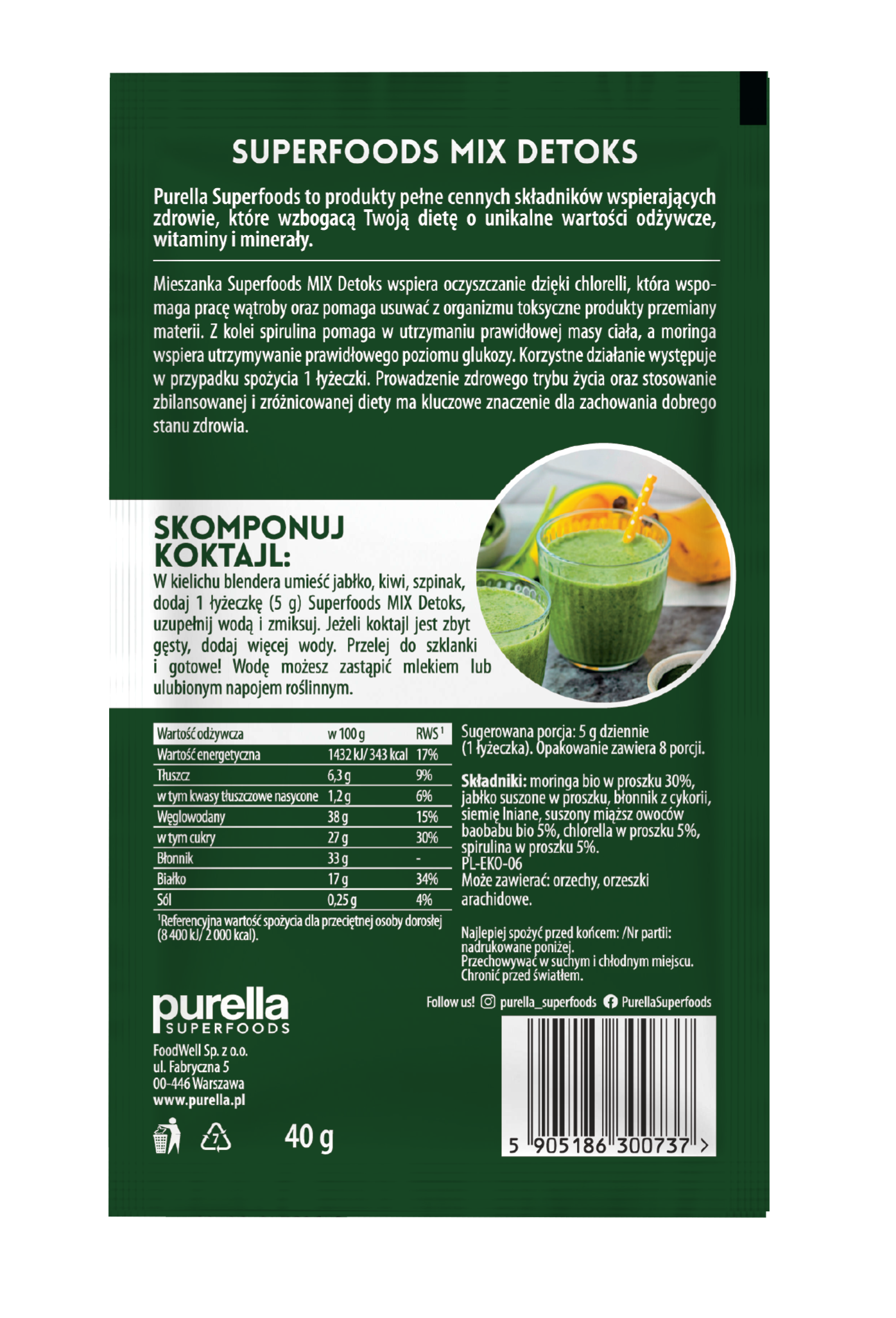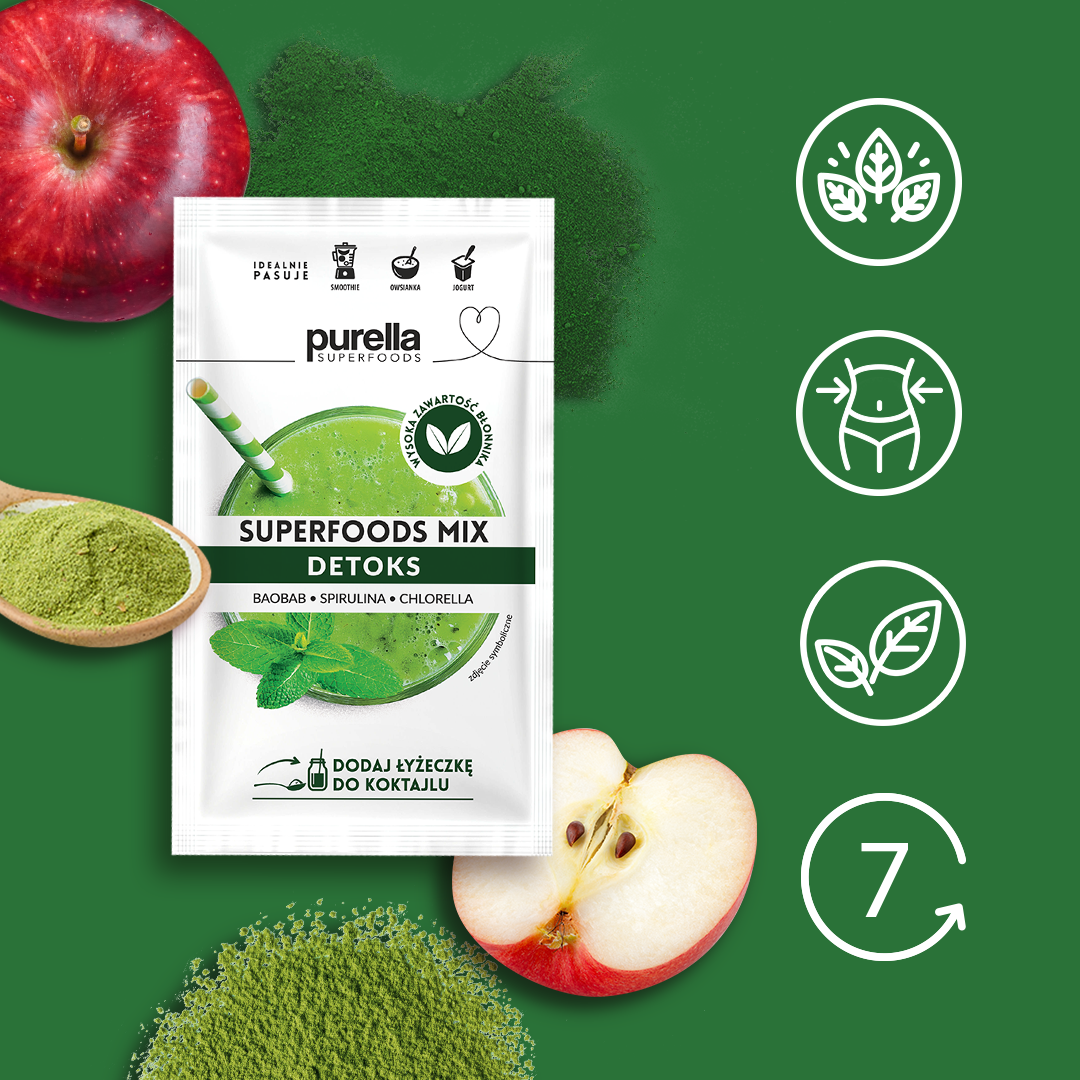 Purella Superfoods to produkty pełne cennych składników wspierających zdrowie, które wzbogacą Twoją dietę o unikalne wartości odżywcze, witaminy i minerały. Mieszanka Superfoods Mix Detoks wspiera oczyszczanie dzięki chlorelli, która wspomaga pracę wątroby oraz pomaga usuwać z organizmu toksyczne produkty przemiany materii. Z kolei spirulina pomaga w utrzymaniu prawidłowej masy ciała, a moringa wspiera utrzymywanie prawidłowego poziomu glukozy. Korzystne działanie występuje w przypadku spożycia 1 łyżeczki. Prowadzenie zdrowego trybu życia oraz stosowanie zbilansowanej i zróżnicowanej diety ma kluczowe znaczenie dla zachowania dobrego stanu zdrowia.