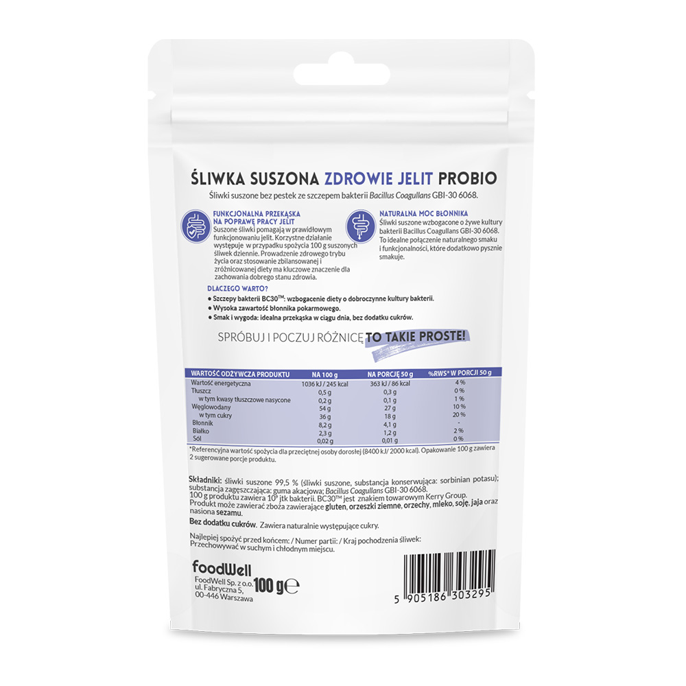 Śliwki suszone PROBIO to doskonałe połączenie tradycyjnego smaku suszonych owoców i nowoczesnych rozwiązań funkcjonalnych. Regularne spożywanie 100 g śliwek dziennie wspomaga trawienie i poprawia komfort pracy jelit. To idealny sposób na naturalne wsparcie organizmu w codziennej diecie.