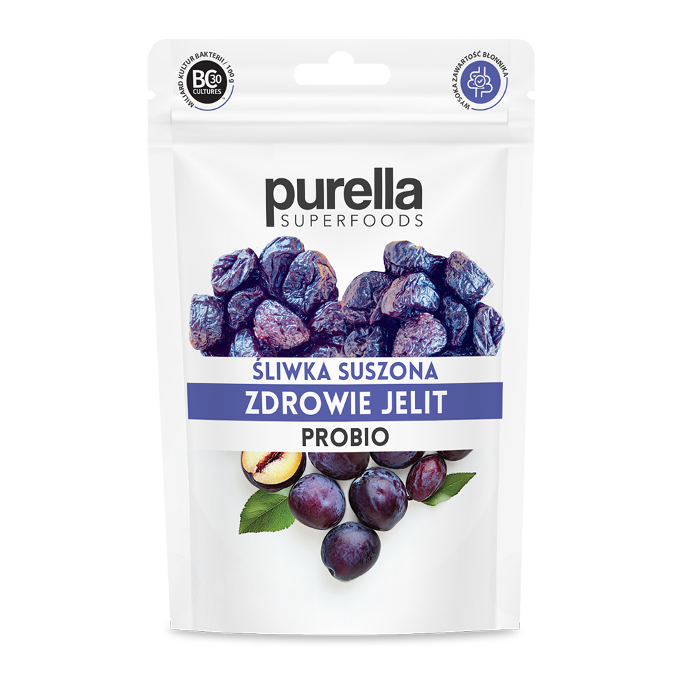 Purella Superfoods Śliwki Suszone to przekąska, która nie tylko smakuje, ale również wspiera prawidłowe funkcjonowanie jelit. Dzięki naturalnej zawartości błonnika oraz wzbogaceniu o szczepy bakterii Bacillus coagulans GBI-30, 6068, każda porcja wspomaga zdrowie jelit w sposób naturalny i skuteczny.