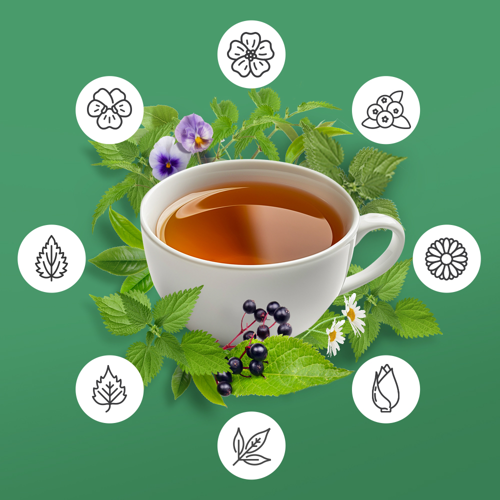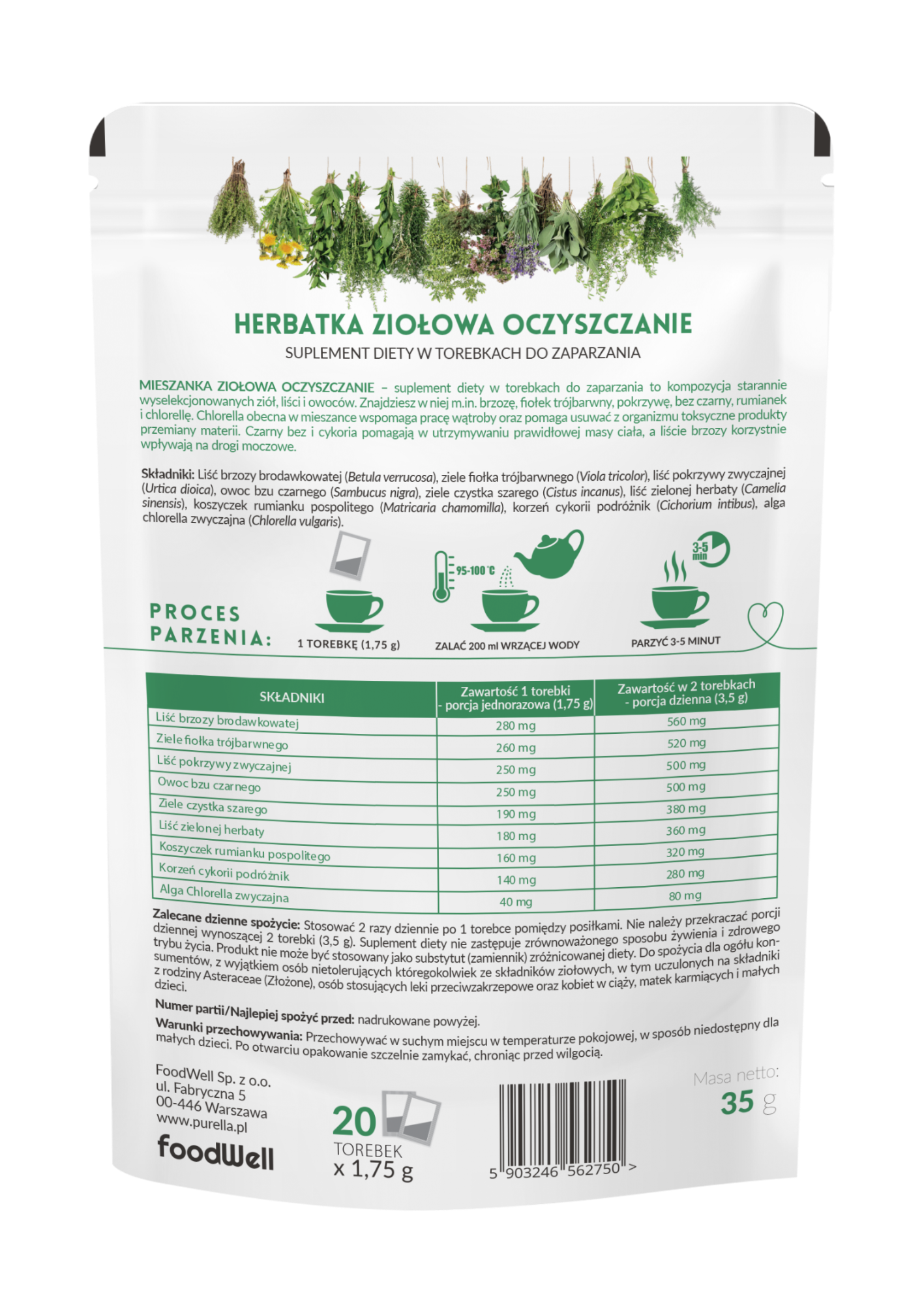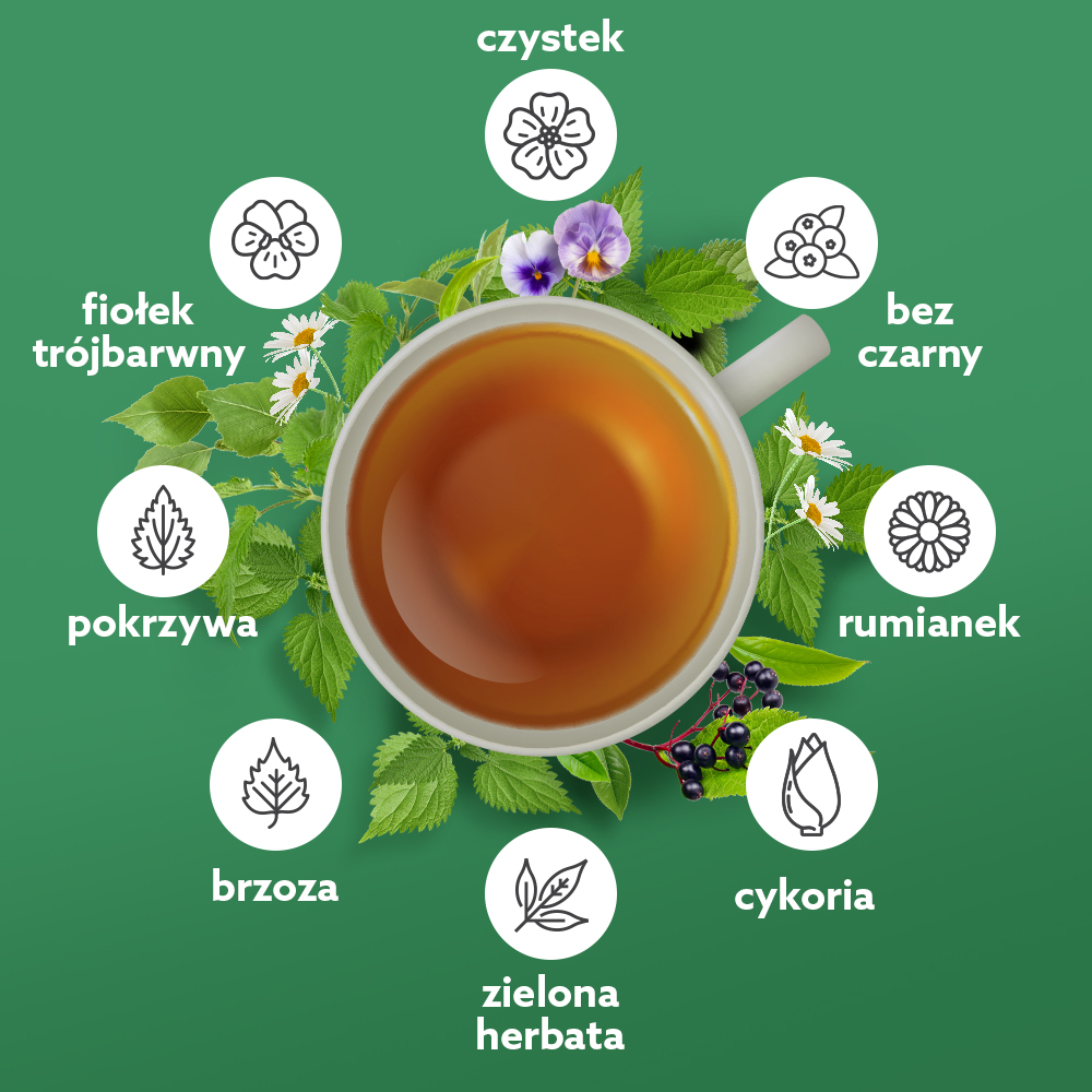 MIESZANKA ZIOŁOWA OCZYSZCZANIE – suplement diety w saszetkach do zaparzania to kompozycja starannie wyselekcjonowanych ziół i owoców. Znajdziesz w niej m.in. brzozę, fiołek trójbarwny, pokrzywę, bez czarny, rumianek i chlorellę. Chlorella obecna w mieszance wspomaga pracę wątroby, pomaga wydalać z organizmu trujące i niezdrowe związki. Czarny bez pomaga w utrzymywaniu wagi, liście brzozy korzystnie wpływają na trawienie i wspomagają procesy detoksykacji organizmu, a cykoria wspiera odchudzanie.