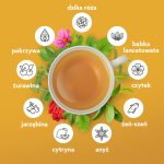 MIESZANKA ZIOŁOWA ODPORNOŚĆ – suplement diety w saszetkach do zaparzania to kompozycja starannie wyselekcjonowanych ziół i owoców. Znajdziesz w niej m.in. dziką różę, babkę lancetowatą, jarzębinę, czystek, żurawinę, żeń-szeń oraz jagody camu camu. Żeń-szeń – jeden ze składników mieszanki, przyczynia się do naturalnych mechanizmów obronnych i prawidłowego funkcjonowania układu odpornościowego. Nie jest jedynym składnikiem mieszanki, który posiada takie funkcje, gdyż dzika róża czy owoc jarzębiny również wspierają układ odpornościowy. Z kolei liść babki lancetowatej stymuluje wzrost korzystnej mikroflory jelitowej.