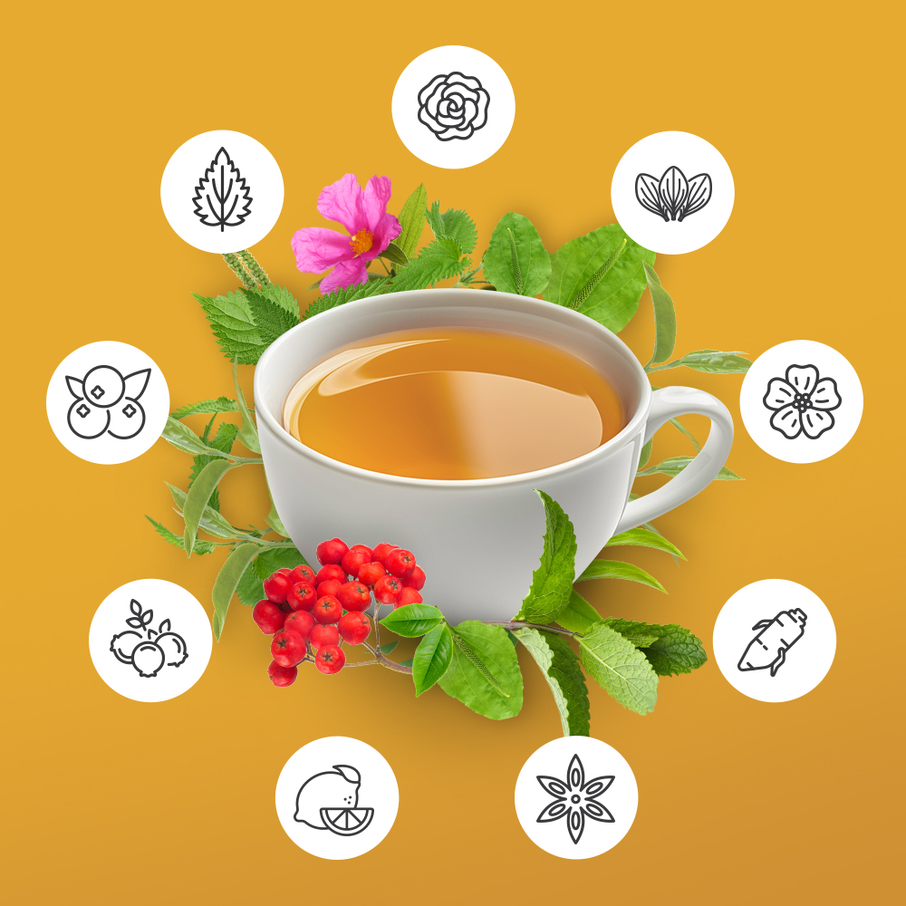 MIESZANKA ZIOŁOWA ODPORNOŚĆ – suplement diety w saszetkach do zaparzania to kompozycja starannie wyselekcjonowanych ziół i owoców. Znajdziesz w niej m.in. dziką różę, babkę lancetowatą, jarzębinę, czystek, żurawinę, żeń-szeń oraz jagody camu camu. Żeń-szeń – jeden ze składników mieszanki, przyczynia się do naturalnych mechanizmów obronnych i prawidłowego funkcjonowania układu odpornościowego. Nie jest jedynym składnikiem mieszanki, który posiada takie funkcje, gdyż dzika róża czy owoc jarzębiny również wspierają układ odpornościowy. Z kolei liść babki lancetowatej stymuluje wzrost korzystnej mikroflory jelitowej.