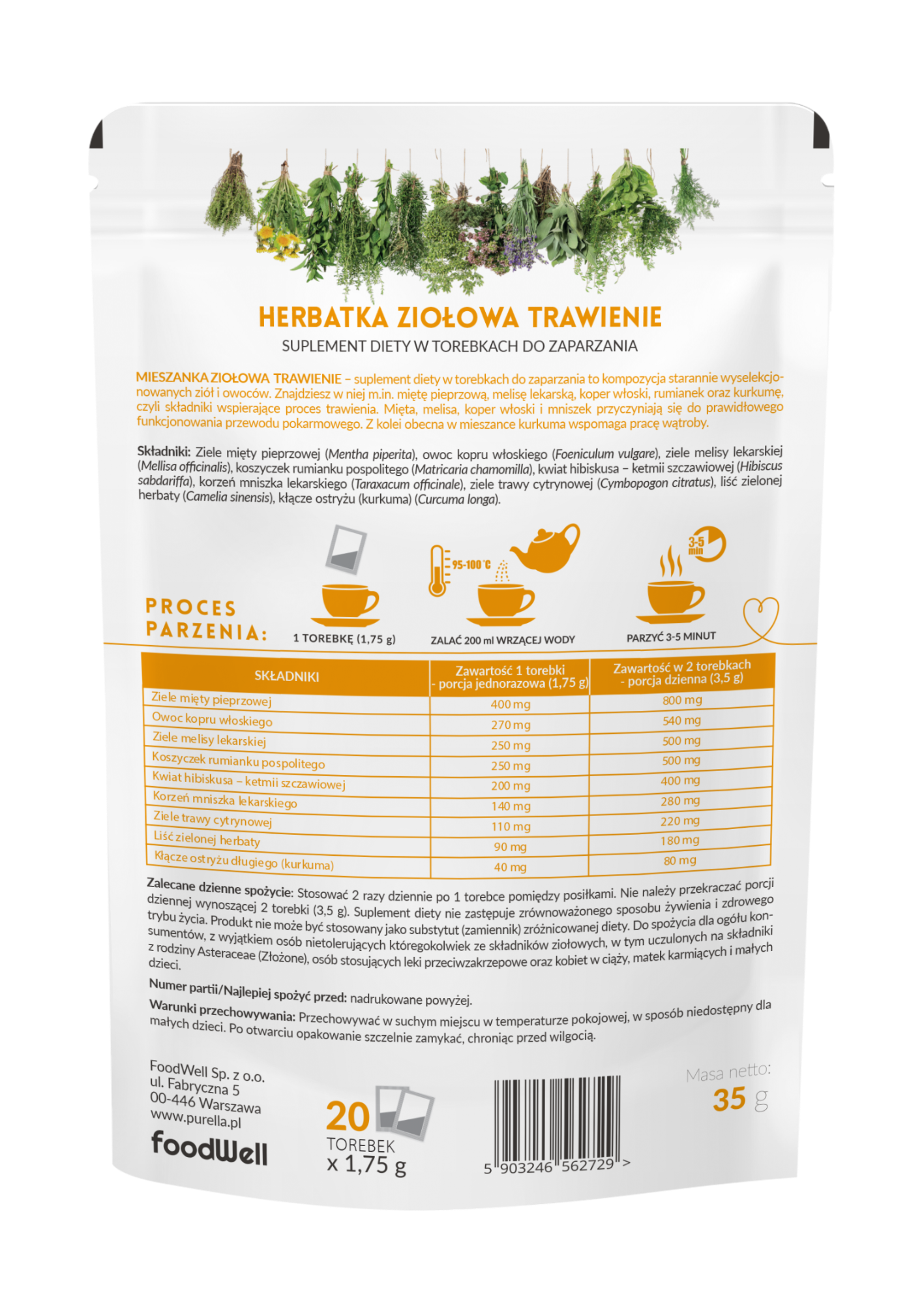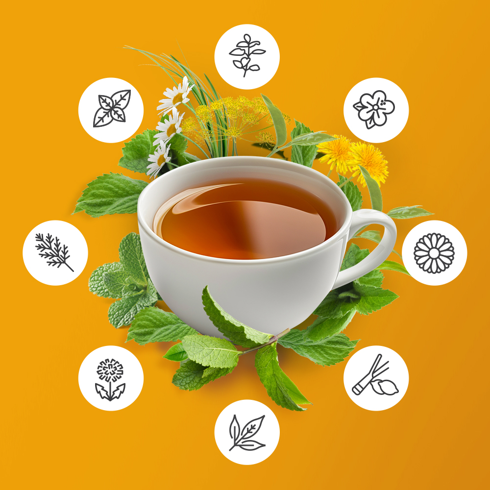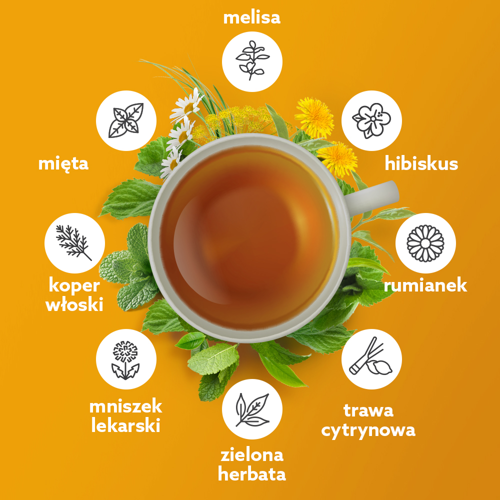 MIESZANKA ZIOŁOWA TRAWIENIE – suplement diety w saszetkach do zaparzania to kompozycja starannie wyselekcjonowanych ziół i owoców. Znajdziesz w niej m.in. miętę, koper włoski, rumianek, mniszek lekarski, trawę cytrynową, hibiskus oraz kurkumę. Zawarty w składzie mieszanki rumianek wspomaga leczenie dolegliwości żołądkowo- jelitowych, takich jak drobne skurcze nabrzmiałego nadbrzusza, wzdęcia i beknięcia. Natomiast koper oraz mięta pomagają przy niestrawnościach. Z kolei obecna w mieszance kurkuma pomaga utrzymać zdrowie wątroby.