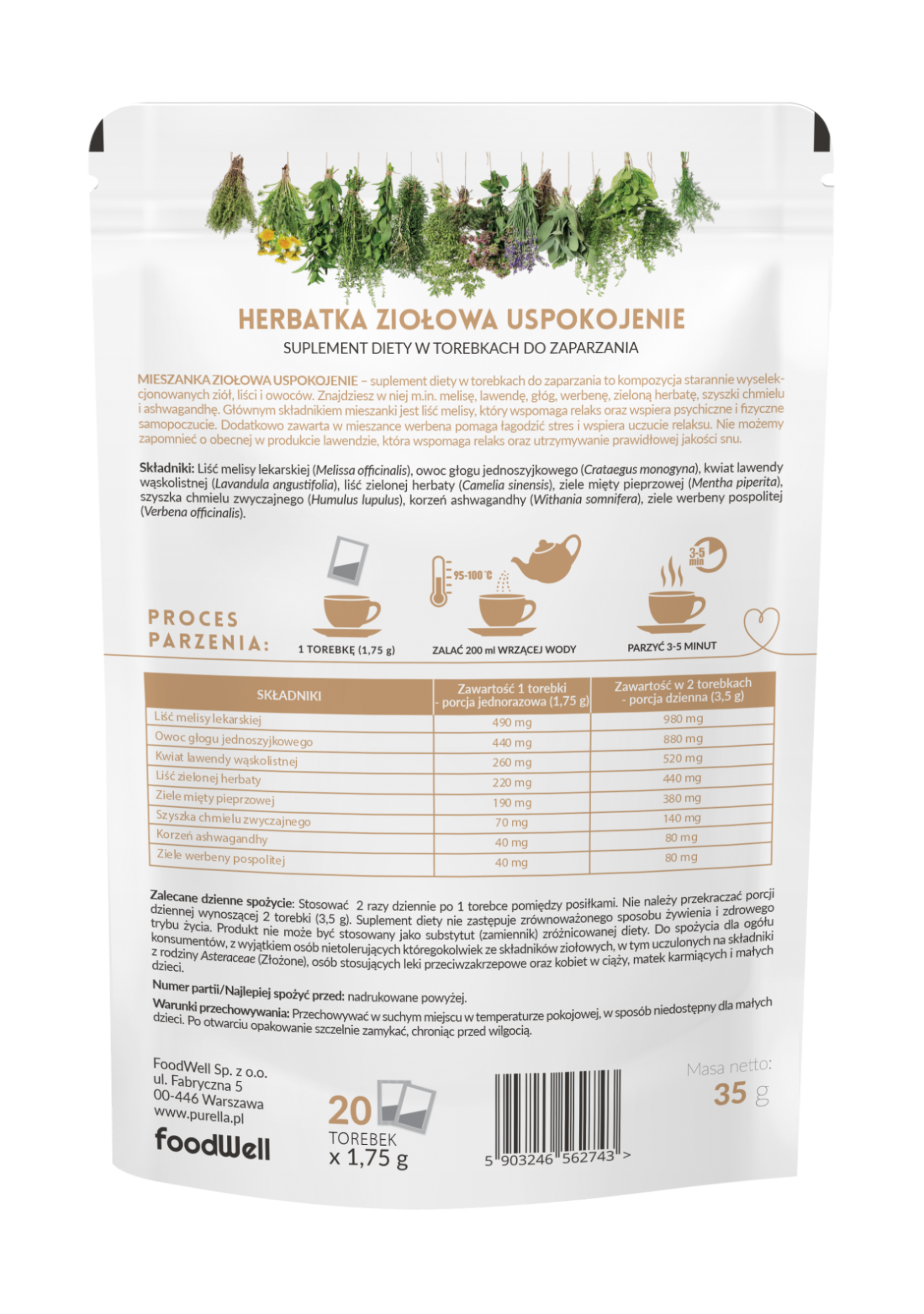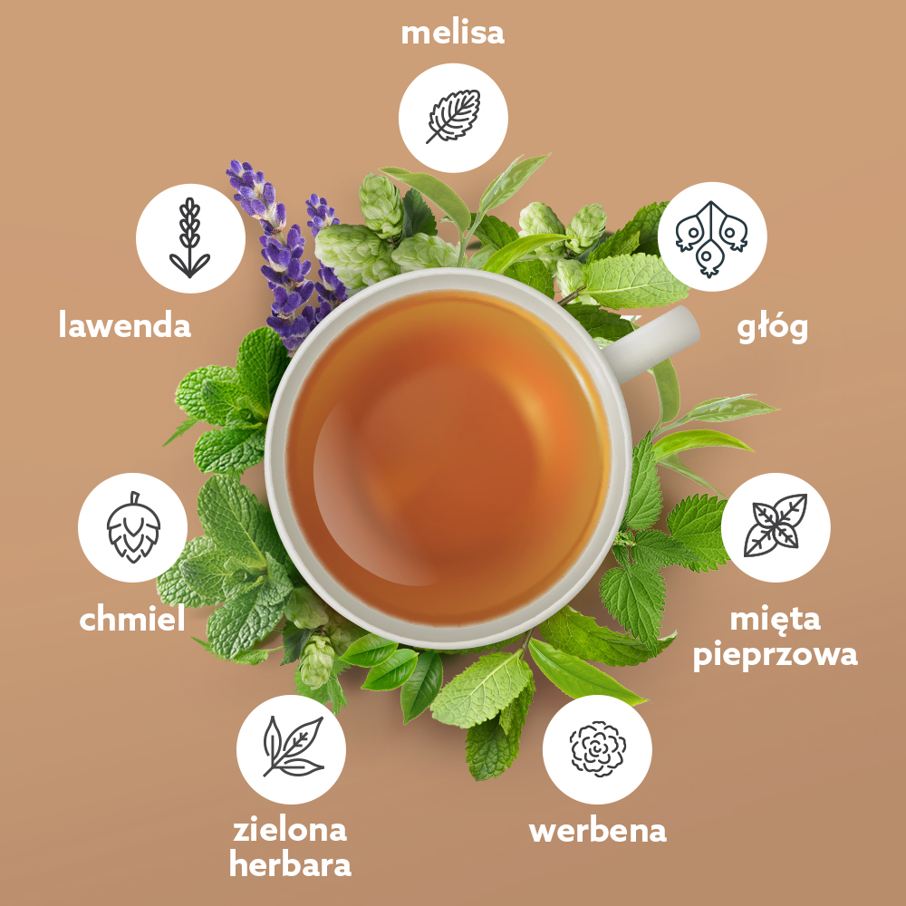 MIESZANKA ZIOŁOWA USPOKOJENIE – suplement diety w saszetkach do zaparzania to kompozycja starannie wyselekcjonowanych ziół i owoców. Znajdziesz w niej m.in. melisę, lawendę, głóg, werbenę, zieloną herbatę, szyszki chmielu i ashwagandhę. Głównym składnikiem mieszanki jest liść melisy, który wspomaga relaks oraz wspiera psychiczne i fizyczne samopoczucie. Dodatkowo zawarta w mieszance werbena pomaga w trakcie cyklu przedmiesiączkowego. Nie możemy zapomnieć o obecnej w produkcie lawendzie, która pomaga w relaksacji oraz w utrzymywaniu zdrowej jakości snu.