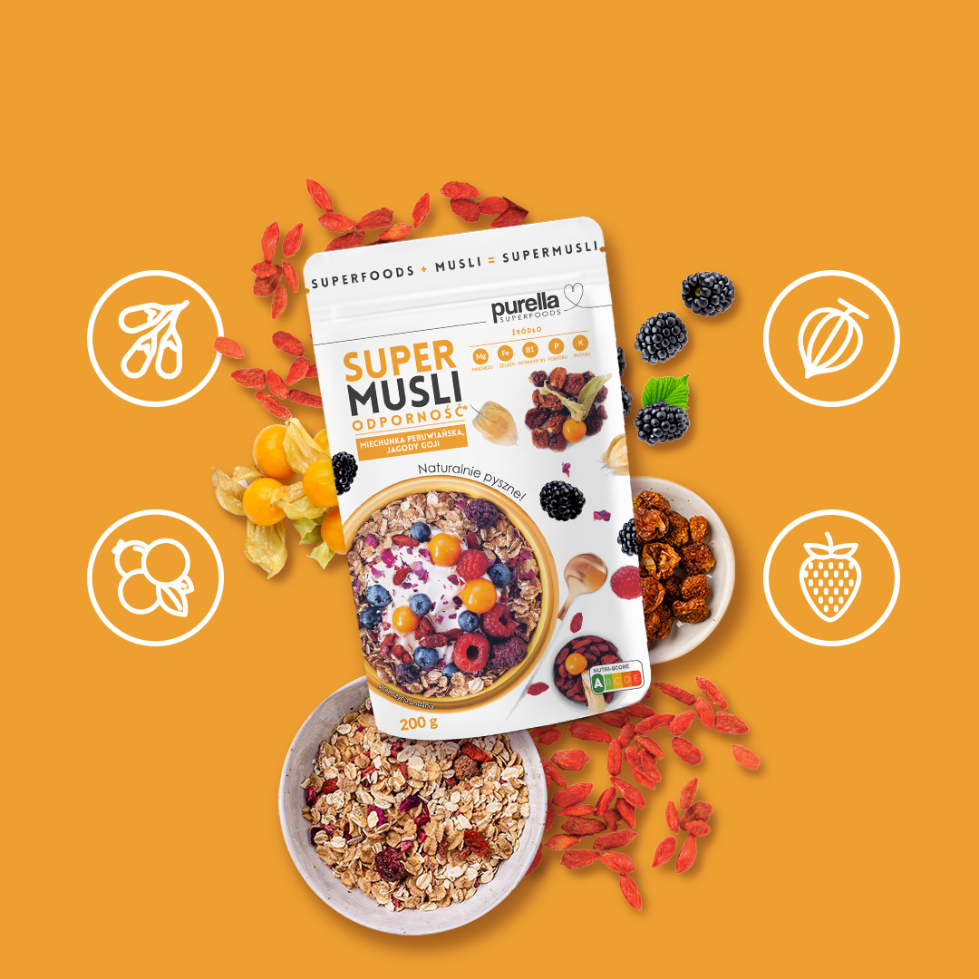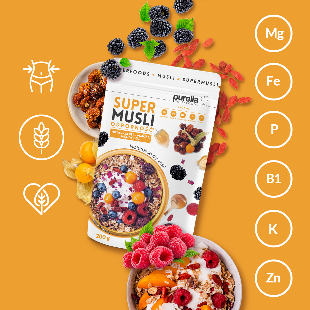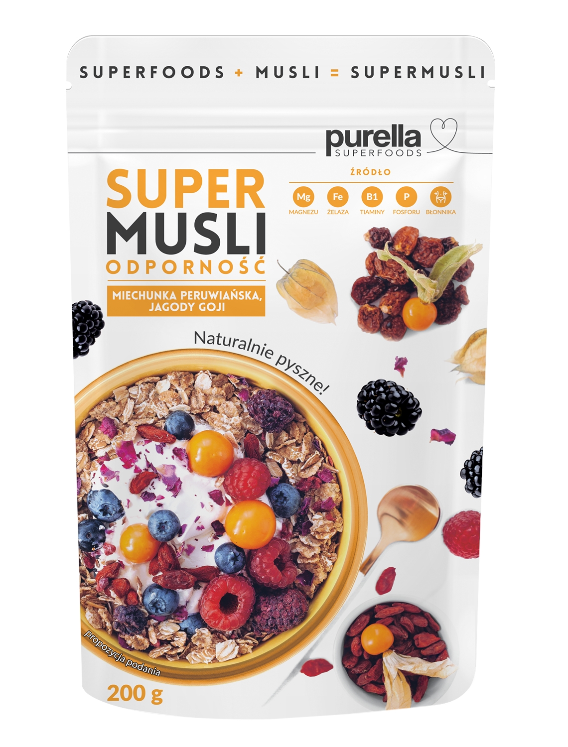 Super Musli Odporność z jagodami goji i żurawiną Purella Superfoods 200g