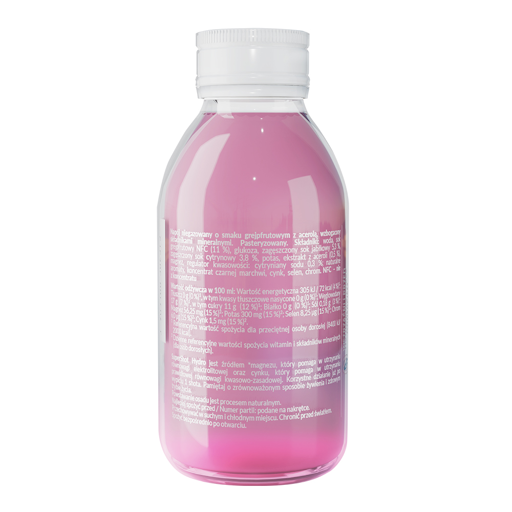 SuperShot Hydro to funkcjonalny napój stworzony z myślą o odpowiednim nawodnieniu i utrzymaniu równowagi elektrolitowej organizmu. Dzięki zawartości sodu i glukozy skutecznie wspiera regenerację po wysiłku i pomaga uzupełnić minerały utracone w ciągu dnia