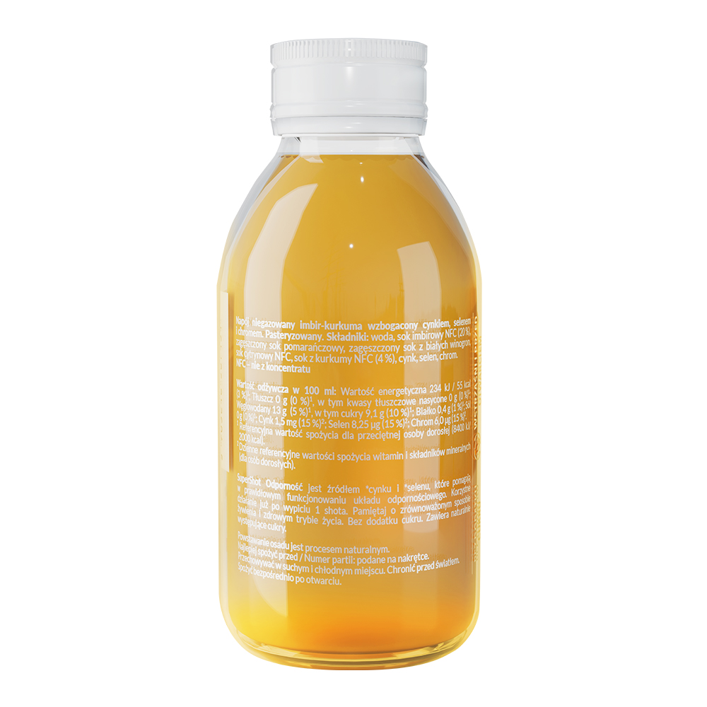 Naturalny napój imbirowy o intensywnym smaku i pięknym, żółto-pomarańczowym kolorze. Zawiera 24% imbiru i kurkumę, dzięki którym wspiera Twoją odporność w naturalny sposób. Produkt nie zawiera dodatku cukru, a jego niska kaloryczność (36 kcal w 100 ml) czyni go idealnym wyborem dla osób dbających o zdrową dietę.