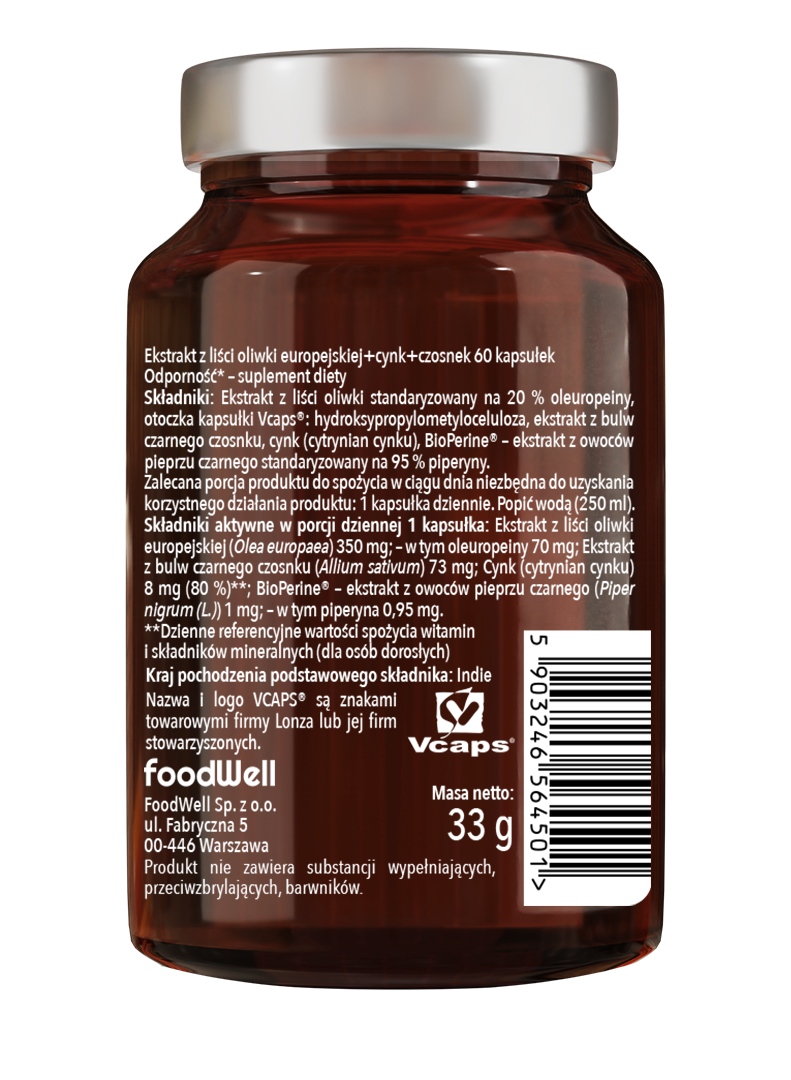 o Składniki te umieszczone zostały w wegańskiej, opatentowanej kapsułce Vcaps®, dzięki czemu produkt nie zawiera substancji wypełniających, przeciwzbrylających czy barwników. Ten suplement diety to unikalna kompozycja trzech składników (ekstraktu z liści oliwki, ekstraktu z czarnego czosnku oraz cynku), które wspierają odporność organizmu. Ponadto, w produkcie znajdziesz ekstrakt z pieprzu czarnego BioPerine®.
