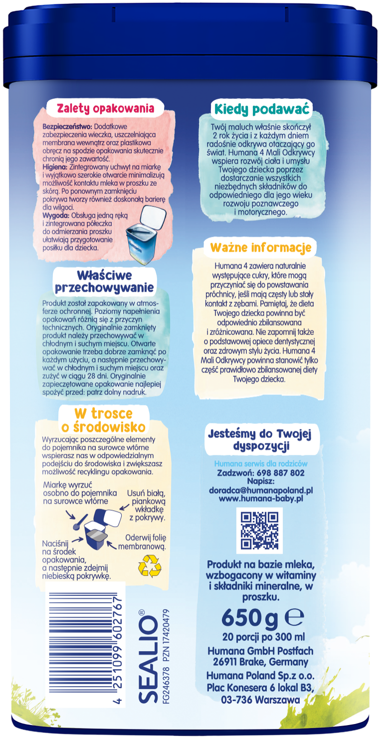 Humana 4 Mali Odkrywcy została opracowana z myślą o starszych dzieciach, aby wspierać ich intensywny rozwój fizyczny i poznawczy każdego dnia.