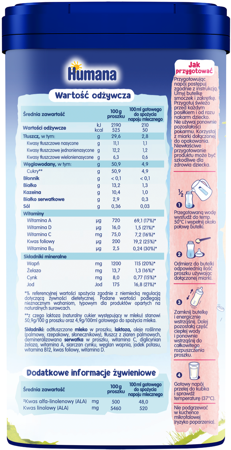 Należy używać wyłącznie miarki Humana dołączonej do opakowania (mieści około 3,2 g). Zalecana dzienna porcja to 300 ml. Podane na etykiecie porcje napoju mlecznego są wartościami przybliżonymi i mogą się różnić z uwagi na indywidualne potrzeby dziecka.