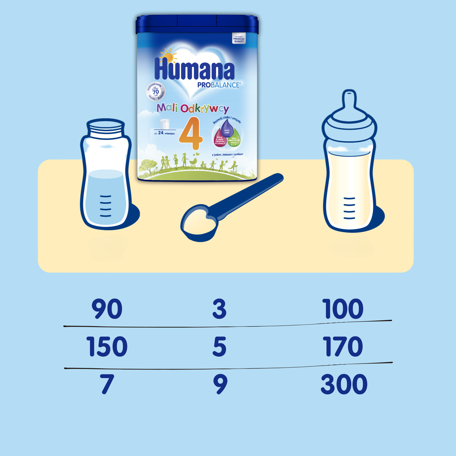 - 270 ml wody – 9 miarek – ok. 300 ml mleka