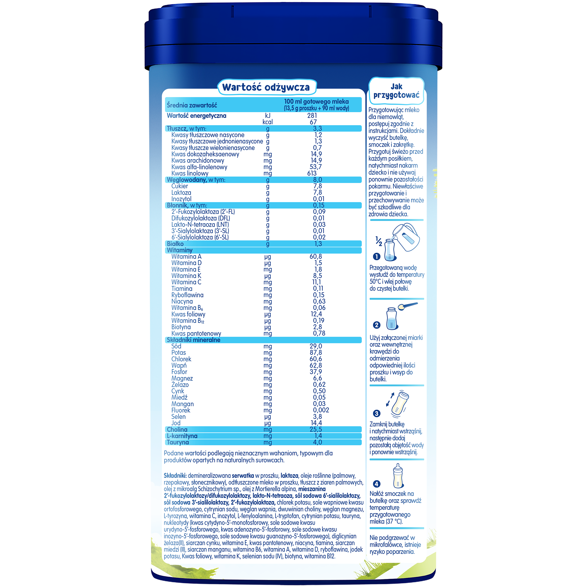 Wartość odżywcza w 100 ml gotowego mleka (13,5 g proszku + 90 ml wody): wartość energetyczna 281 kJ / 67 kcal; tłuszcz 3,3 g (w tym nasycone 1,2 g, jednonienasycone 1,3 g, wielonienasycone 0,7 g; DHA 14,9 mg, ARA 14,9 mg, kwas alfa-linolenowy 53,7 mg, kwas linolowy 613 mg); węglowodany 8,0 g (w tym cukry 7,8 g, laktoza 7,8 g, inozytol 0,01 g); błonnik 0,15 g (2′-FL 0,09 g, DFL 0,01 g, LNT 0,03 g, 3′-SL 0,01 g, 6′-SL 0,02 g); białko 1,3 g; witaminy: A 60,8 µg, D 1,5 µg, E 1,8 mg, K 8,5 µg, C 11,1 mg, tiaminy 0,11 mg, ryboflawiny 0,15 mg, niacyny 0,63 mg, B6 0,06 mg, kwas foliowy 12,4 µg, B12 0,19 µg, biotyna 2,8 µg, kwas pantotenowy 0,78 mg; składniki mineralne: sód 29,0 mg, potas 87,8 mg, chlorek 60,6 mg, wapń 62,8 mg, fosfor 37,9 mg, magnez 6,6 mg, żelazo 0,62 mg, cynk 0,50 mg, miedź 0,05 mg, mangan 0,03 mg, fluorek 0,002 mg, selen 3,8 µg, jod 14,4 µg; cholina 25,5 mg, L-karnityna 1,4 mg, tauryna 4,0 mg.