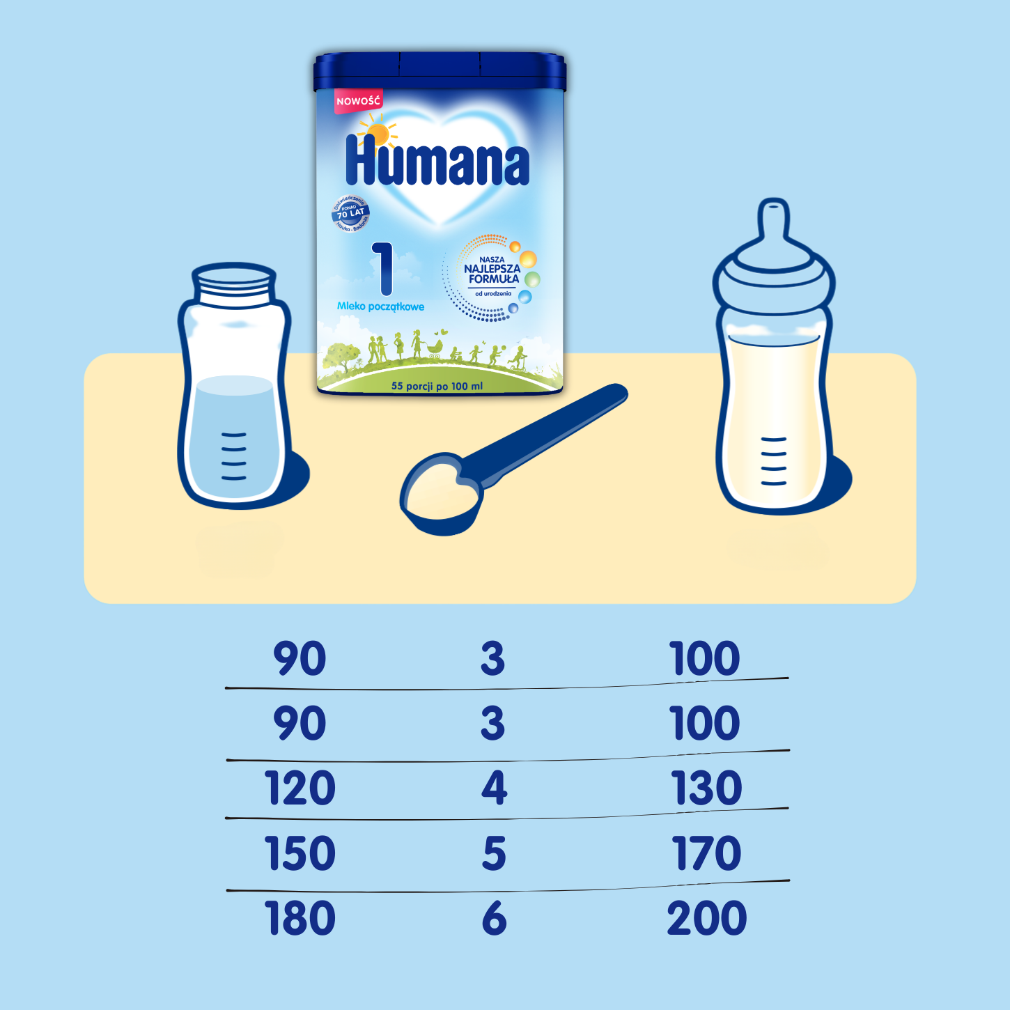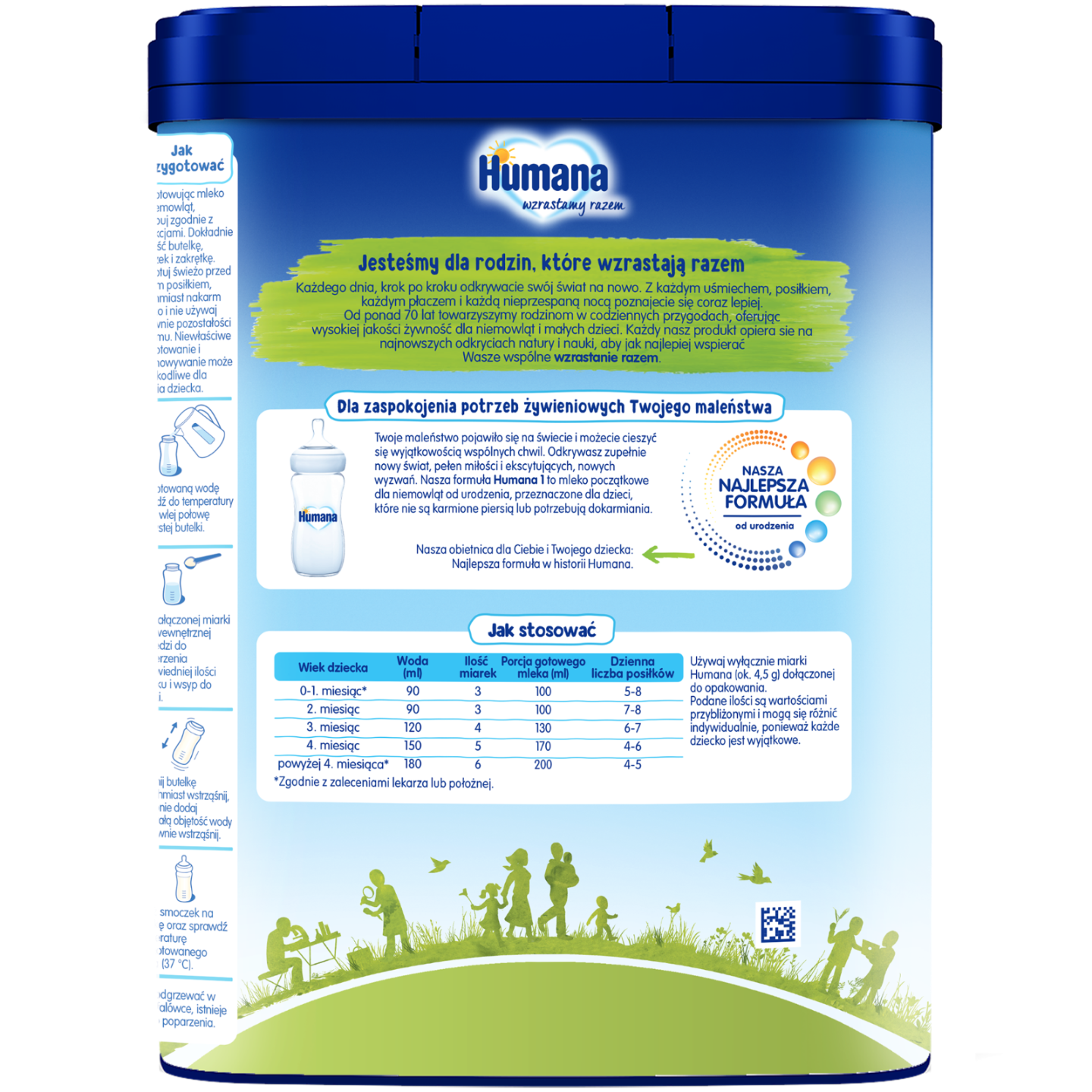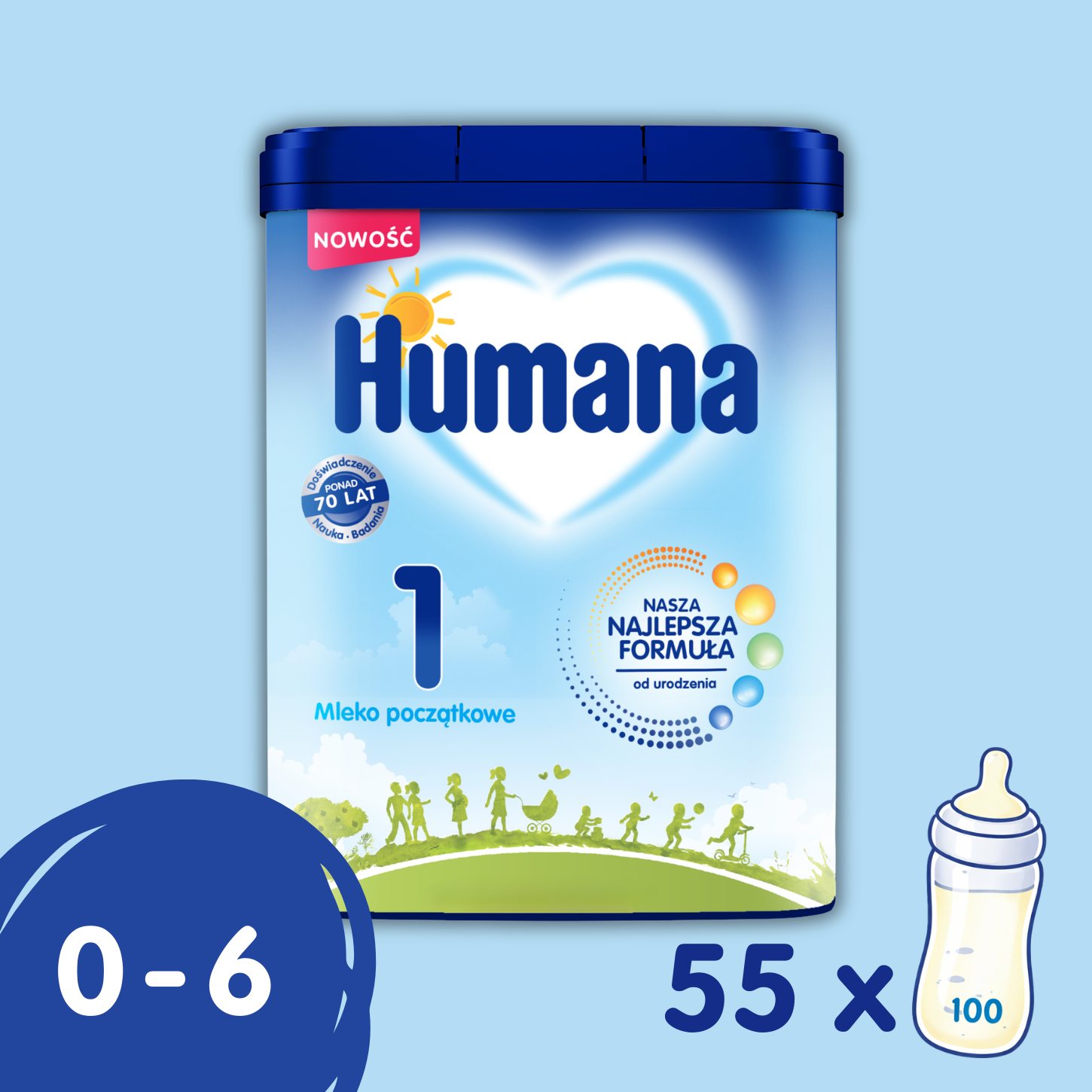 Humana 1 jest mlekiem początkowym do stosowania od urodzenia i jest przeznaczona dla niemowląt, które nie są karmione piersią lub potrzebują dokarmiania. Jedno opakowanie wystarcza na około 55 porcji po 100 ml.